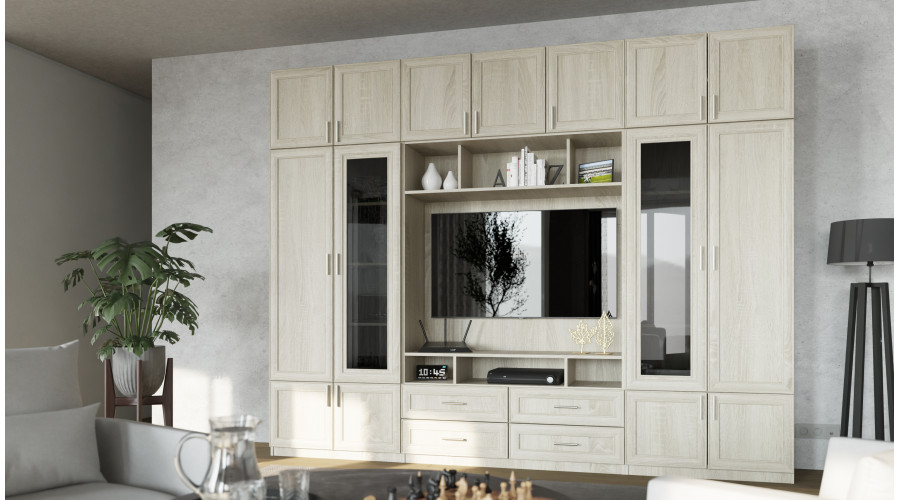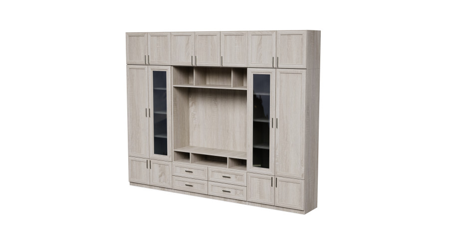 TV spintelė su stiklinėmis vitrinomis 303 × 240 cm Sonoma Jasna – VERO
