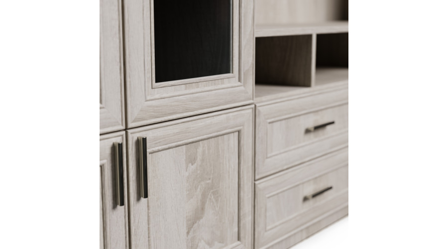 Centrinėje televizoriaus zonoje patogiai įsitaisys televizorius ir multimedijos įranga, o platus lentynų ir rakinamų spintelių išdėstymas leidžia estetiškai laikyti knygas, dekoracijas ir kasdienius aksesuarus. Stiklinės vitrinos yra vienas iš pagrindinių VERO sieninės spintelės skiriamųjų bruožų – jose galima eksponuoti ornamentus, stiklo dirbinius ar kolekcijas, kartu suteikiant visai konstrukcijai modernumo.