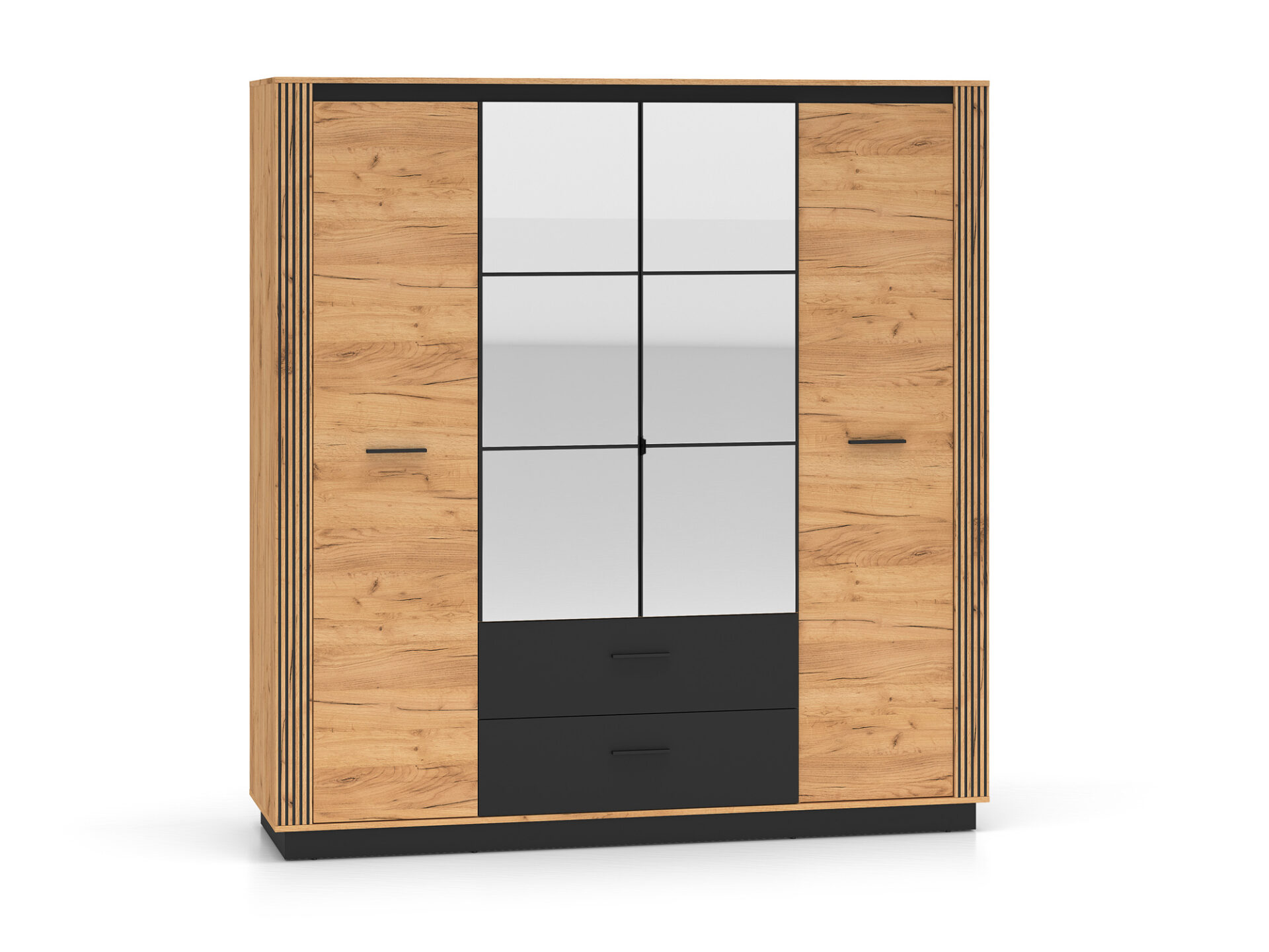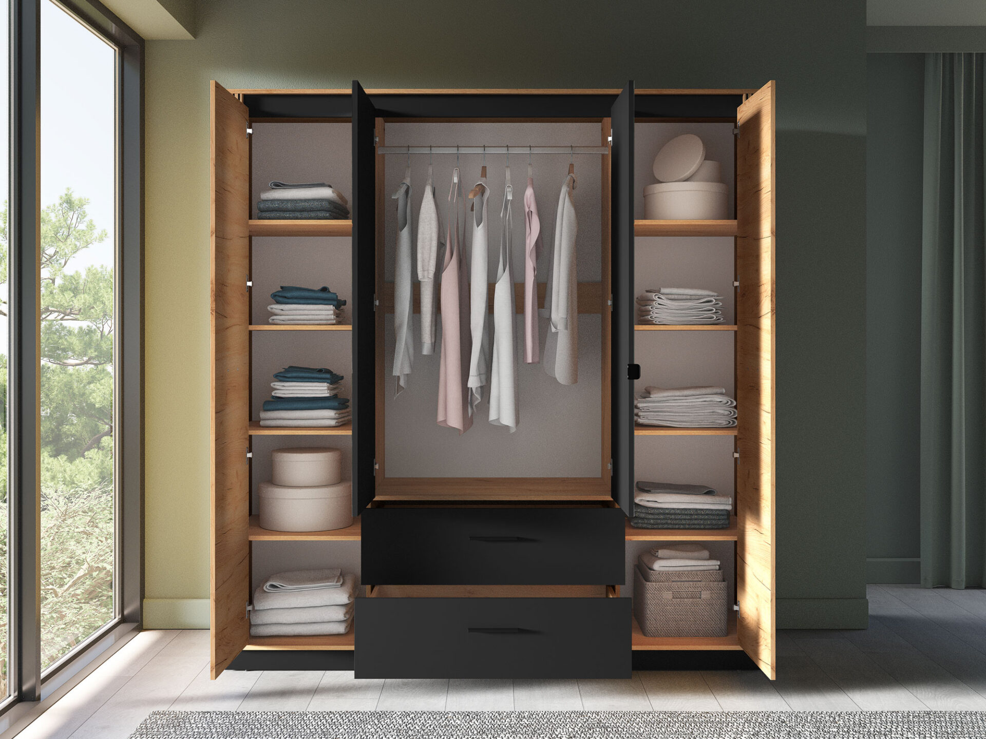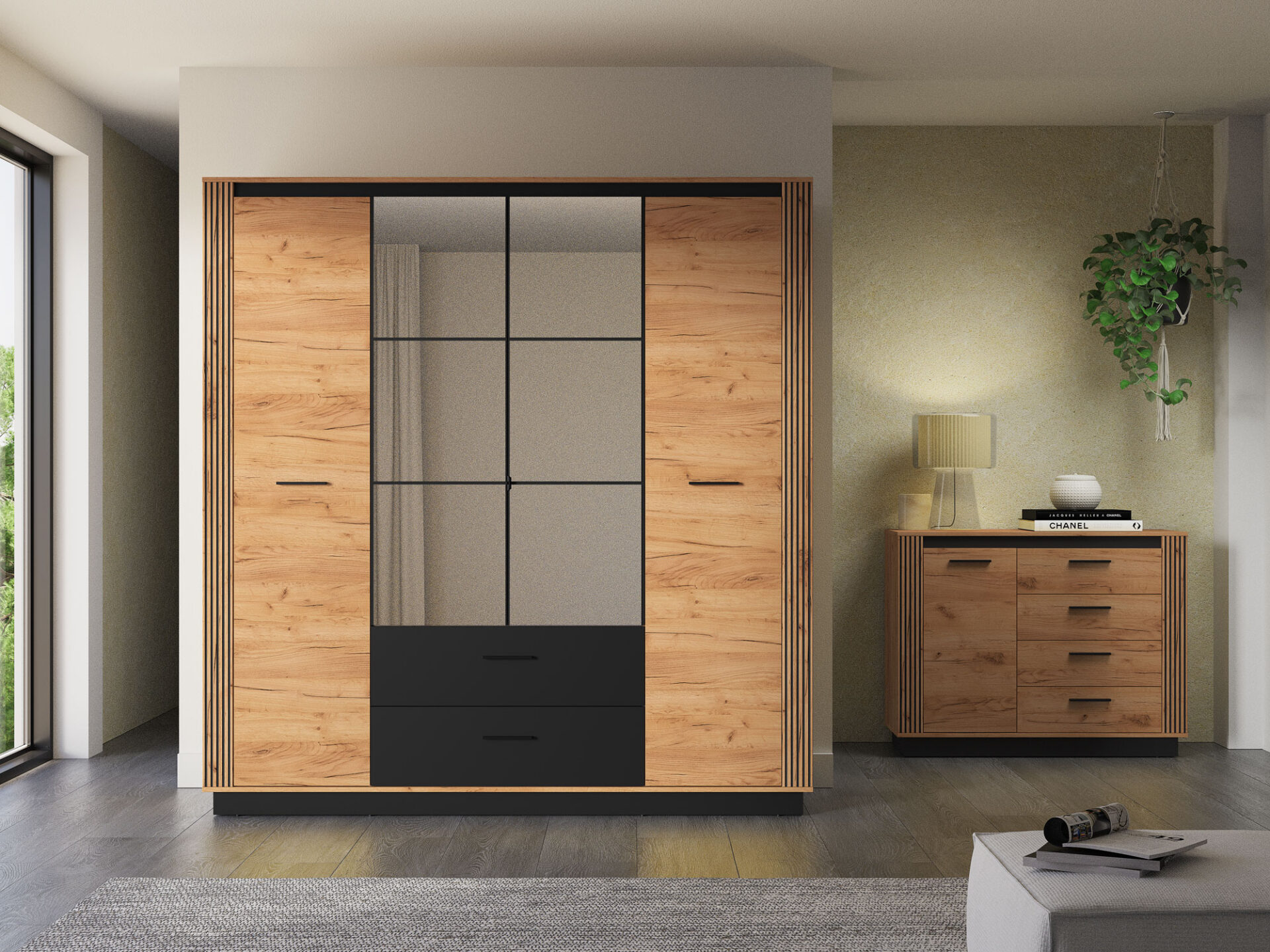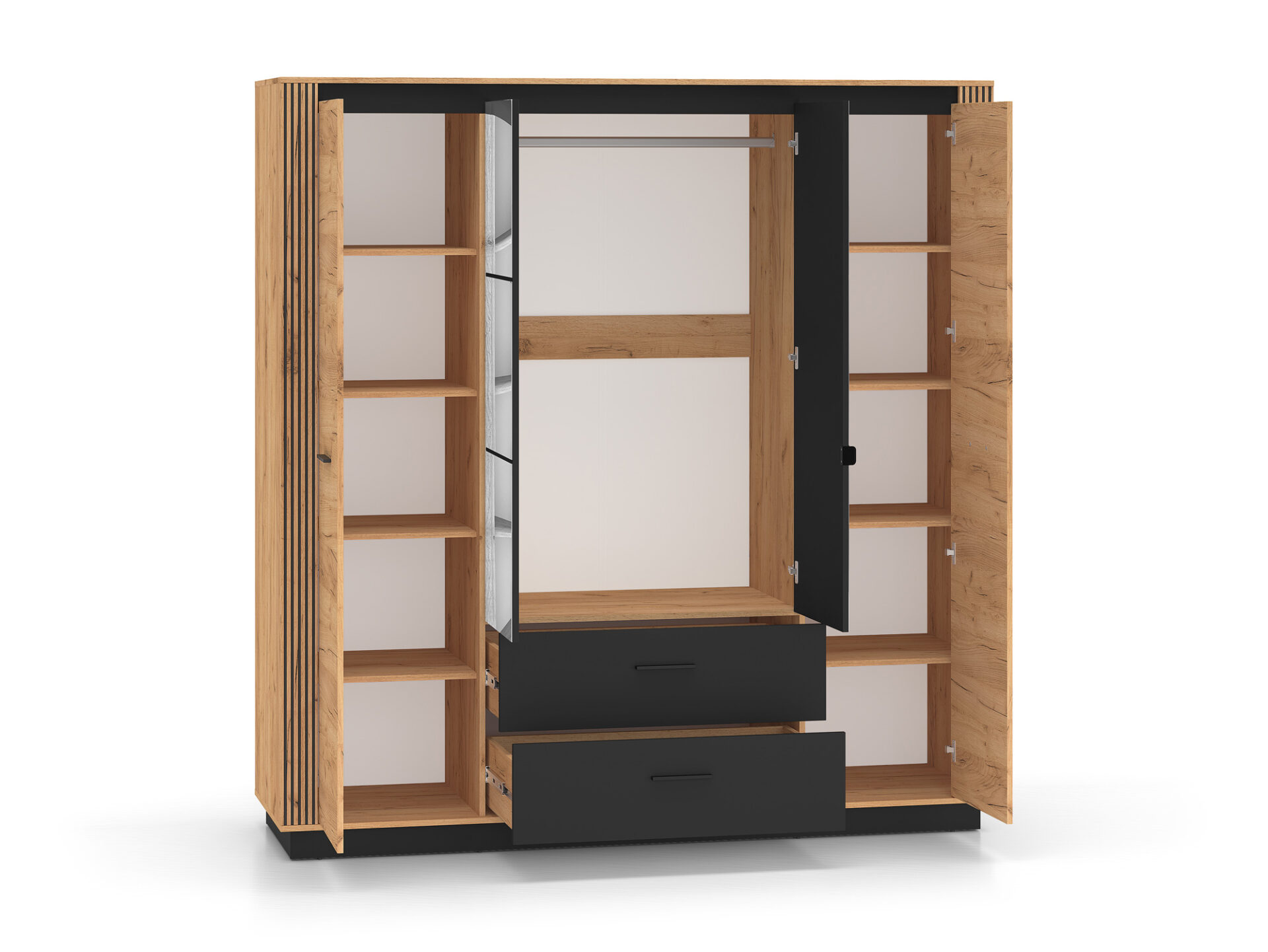Keturių durų „Urso 01“ spinta – tai baldas, puikiai tinkantis drabužiams, aksesuarams ir kitiems namų tekstilės gaminiams laikyti. Konstrukcija suskirstyta į keturias funkcines zonas. Pagrindinė dalis – didelė erdvė su tvirta strypu marškiniams, kostiumams ar kelnėms pakabinti. Kairėje ir dešinėje spintos pusėse iš viso yra dešimt erdvių nišų, kuriose galite tvarkingai laikyti drabužius ar kitus daiktus. Apatinėje spintos dalyje yra du dideli stalčiai, puikiai tinkantys apatiniams drabužiams ar kojinėms. Du centriniai fasadai papuošti šešiais veidrodžiais, kurie palengvina kasdienį stilių ir rengimąsi. Veidrodiniai skydeliai dar labiau vizualiai padidins erdvę. „Urso 01“ dizainas derina klasikinį ąžuolo rašto stilių su moderniu juodų elementų pavidalu. Originalūs, frezuoti įdėklai pabrėžia unikalų visų „Urso“ kolekcijos gaminių charakterį.