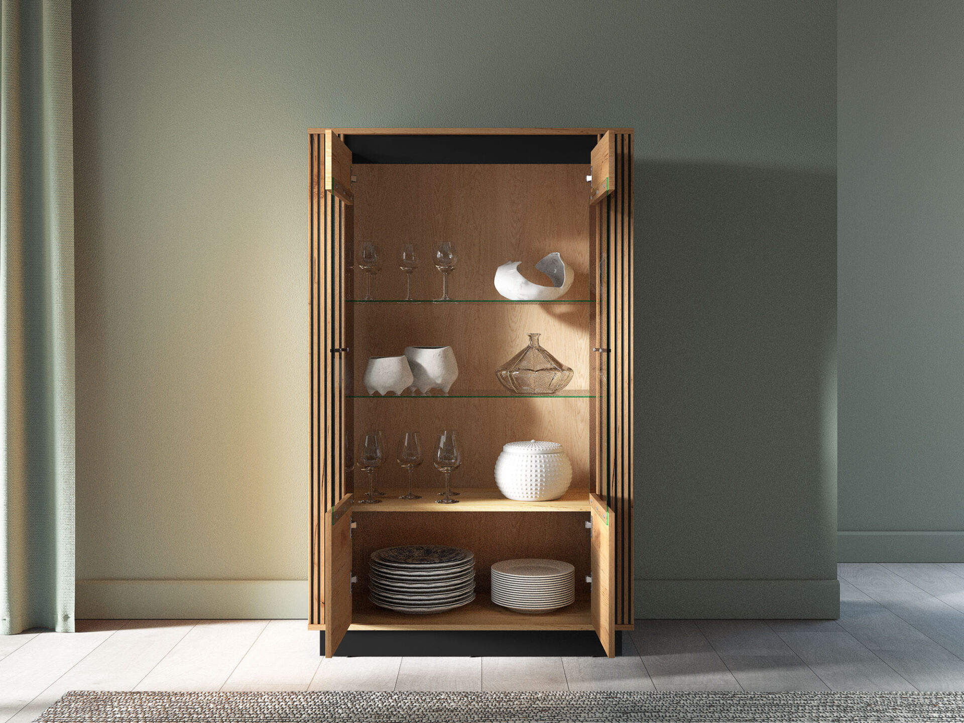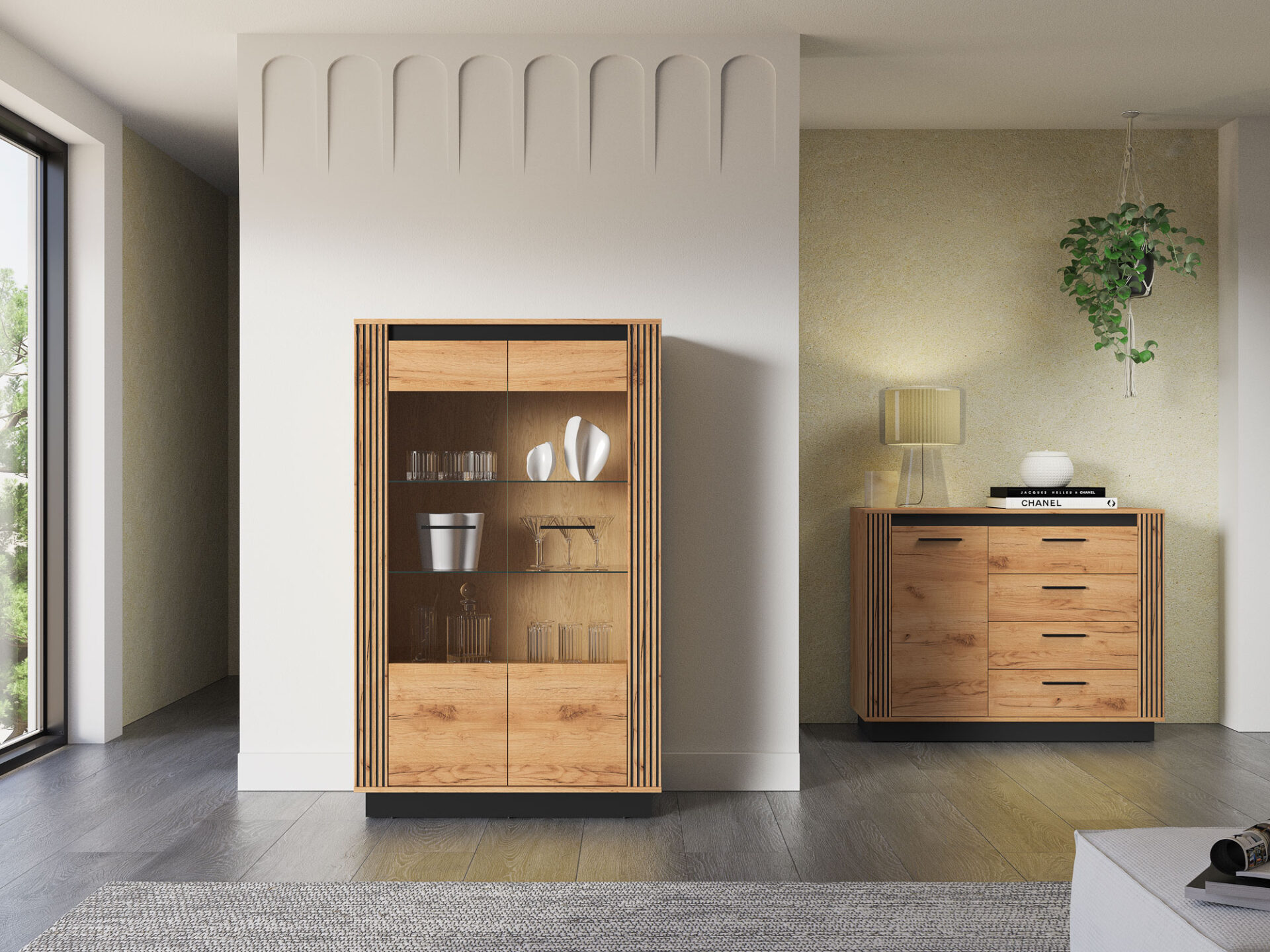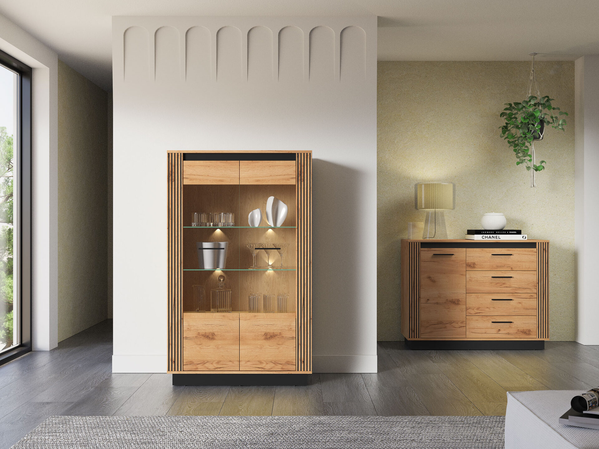 „Urso 05“ vitrina – tai baldas, leidžiantis jums eksponuoti mėgstamiausius daiktus. Dvi stiklinės lentynos erdvę padalija į keturias nišas su dvigubomis durelėmis. Joje galite eksponuoti taures, porceliano kolekciją ar suvenyrus iš kelionių. Jei norite dar labiau išryškinti savo mėgstamiausius daiktus, rinkitės mūsų LED stiklinės lentynos apšvietimą. Spintelės sklindanti šviesa subtiliai sušildys visą jūsų interjerą. Apatinėje spintelės dalyje yra erdvi lentyna, puikiai tinkanti stalo įrankiams ar staltiesėms laikyti. „Urso 05“ dizainas derina klasikinį ąžuolo rašto stilių su moderniu juodų elementų pavidalu. Originalūs, frezuoti įdėklai pabrėžia unikalų visų „Urso“ kolekcijos gaminių charakterį.