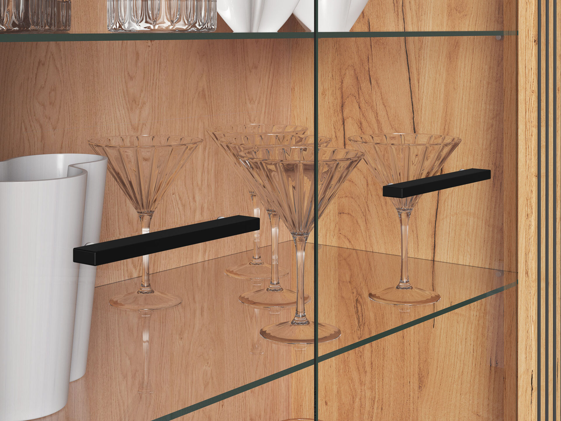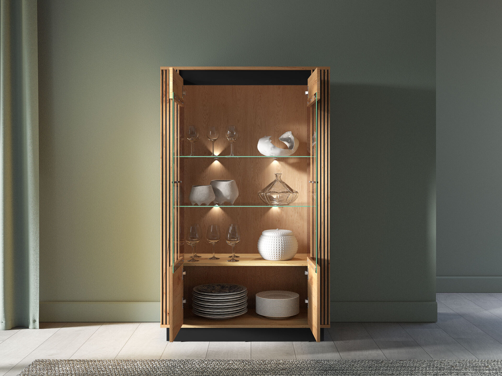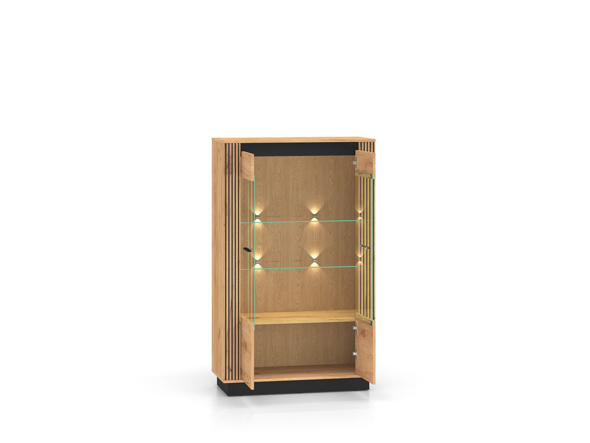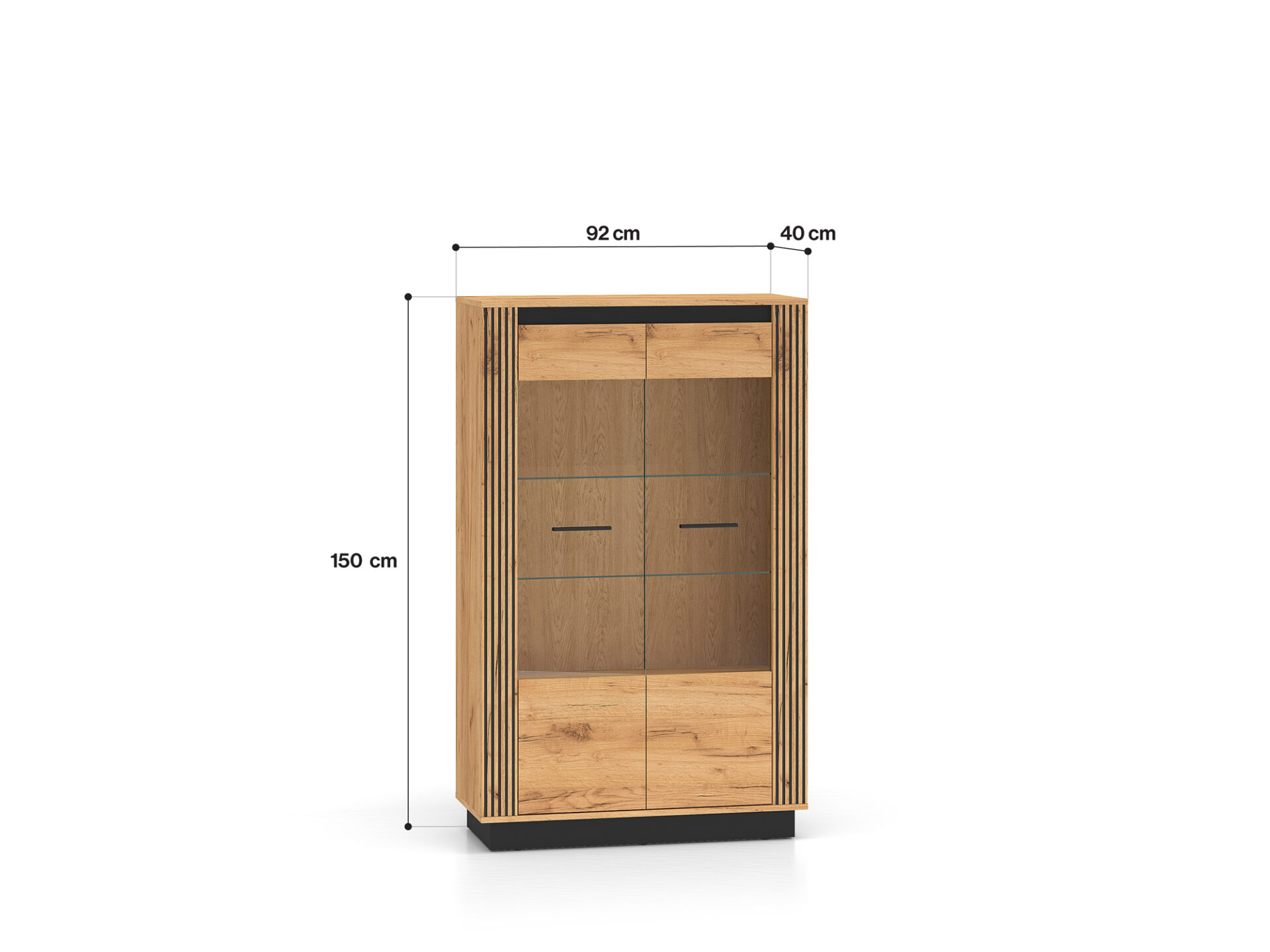 „Urso 05“ vitrina – tai baldas, leidžiantis jums eksponuoti mėgstamiausius daiktus. Dvi stiklinės lentynos erdvę padalija į keturias nišas su dvigubomis durelėmis. Joje galite eksponuoti taures, porceliano kolekciją ar suvenyrus iš kelionių. Jei norite dar labiau išryškinti savo mėgstamiausius daiktus, rinkitės mūsų LED stiklinės lentynos apšvietimą. Spintelės sklindanti šviesa subtiliai sušildys visą jūsų interjerą. Apatinėje spintelės dalyje yra erdvi lentyna, puikiai tinkanti stalo įrankiams ar staltiesėms laikyti. „Urso 05“ dizainas derina klasikinį ąžuolo rašto stilių su moderniu juodų elementų pavidalu. Originalūs, frezuoti įdėklai pabrėžia unikalų visų „Urso“ kolekcijos gaminių charakterį.