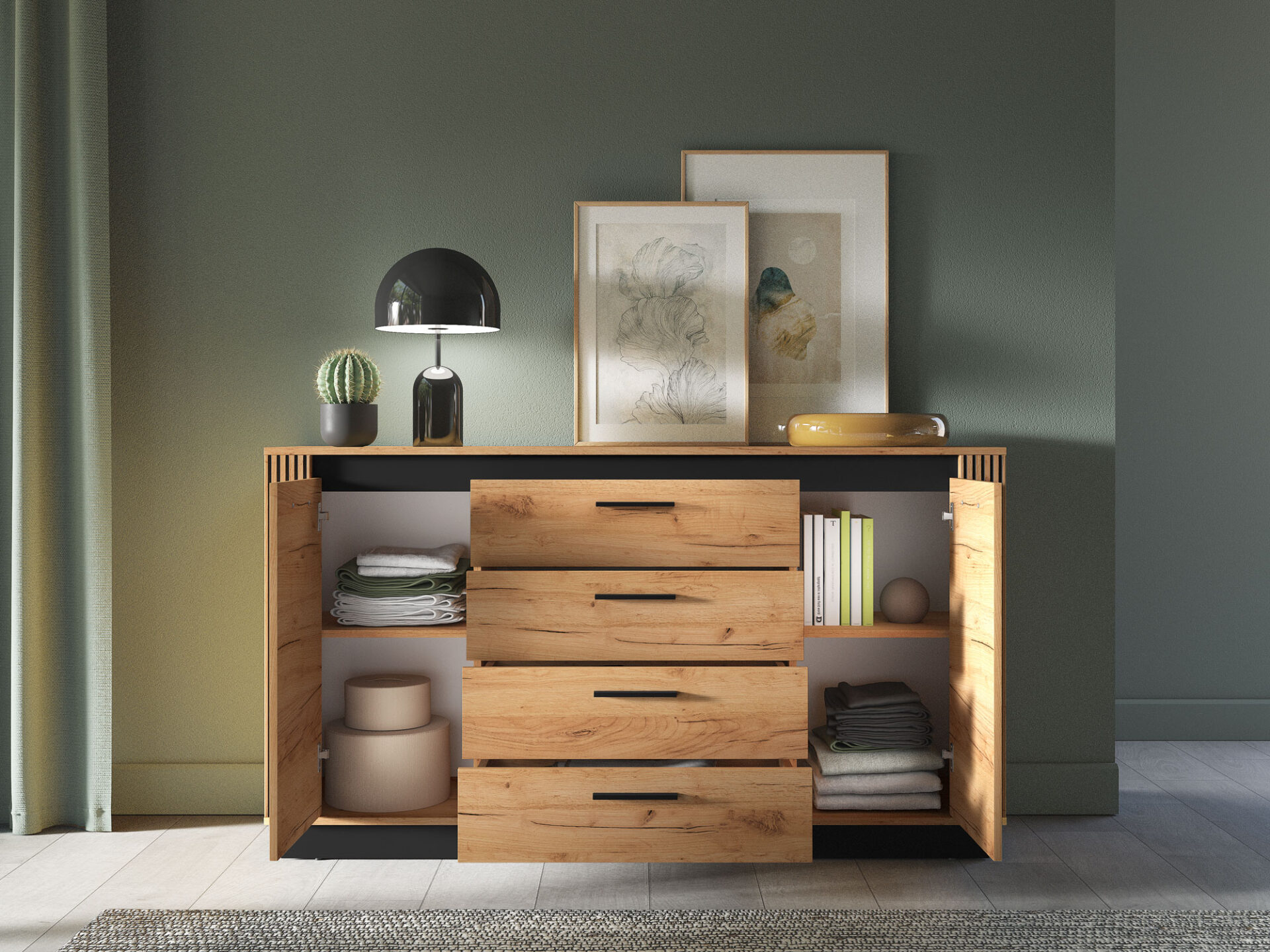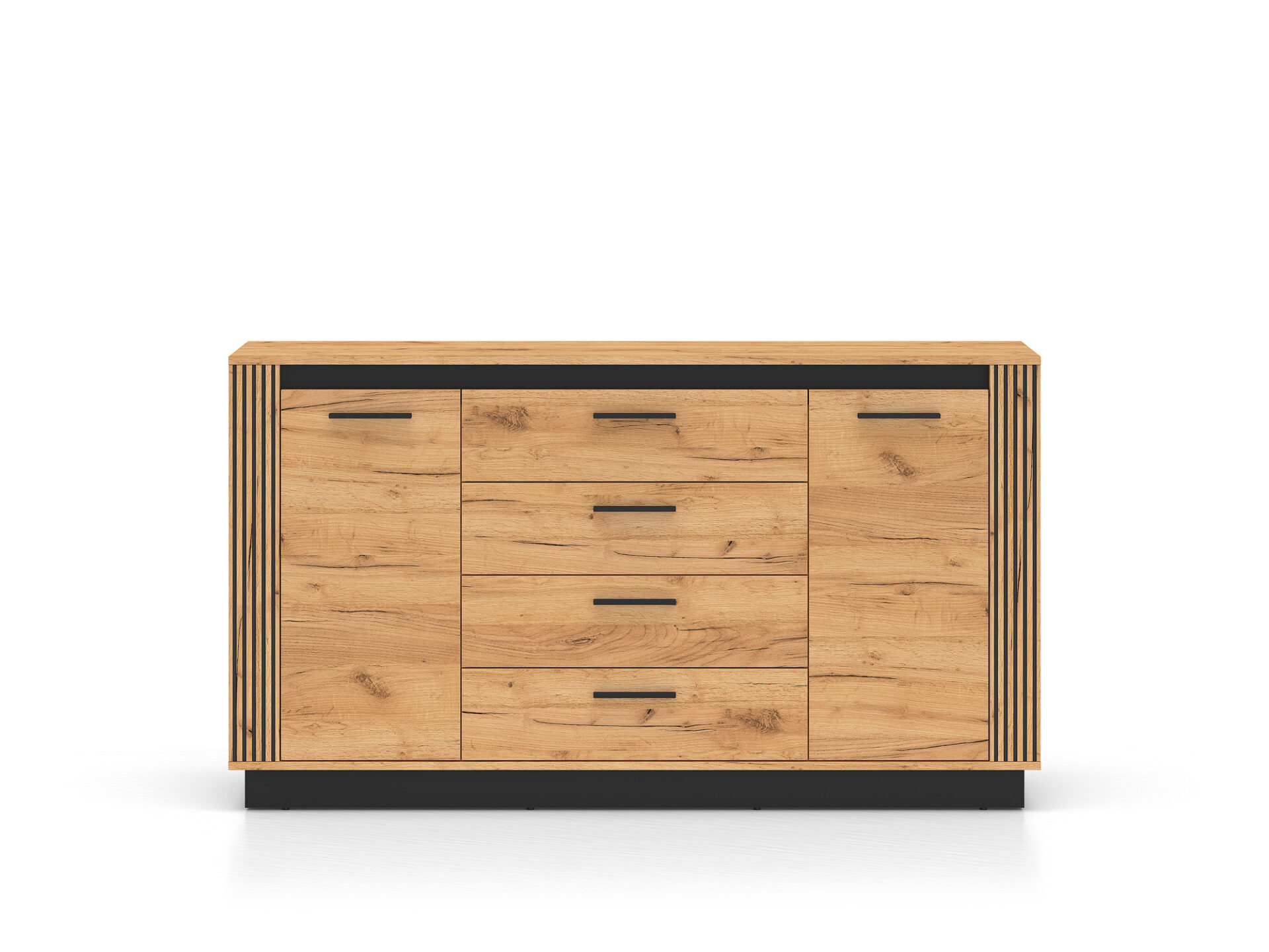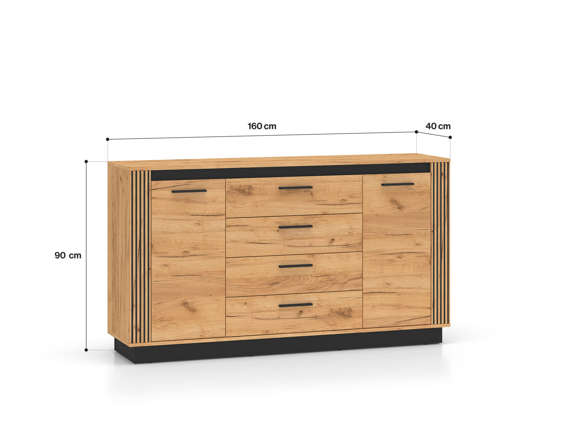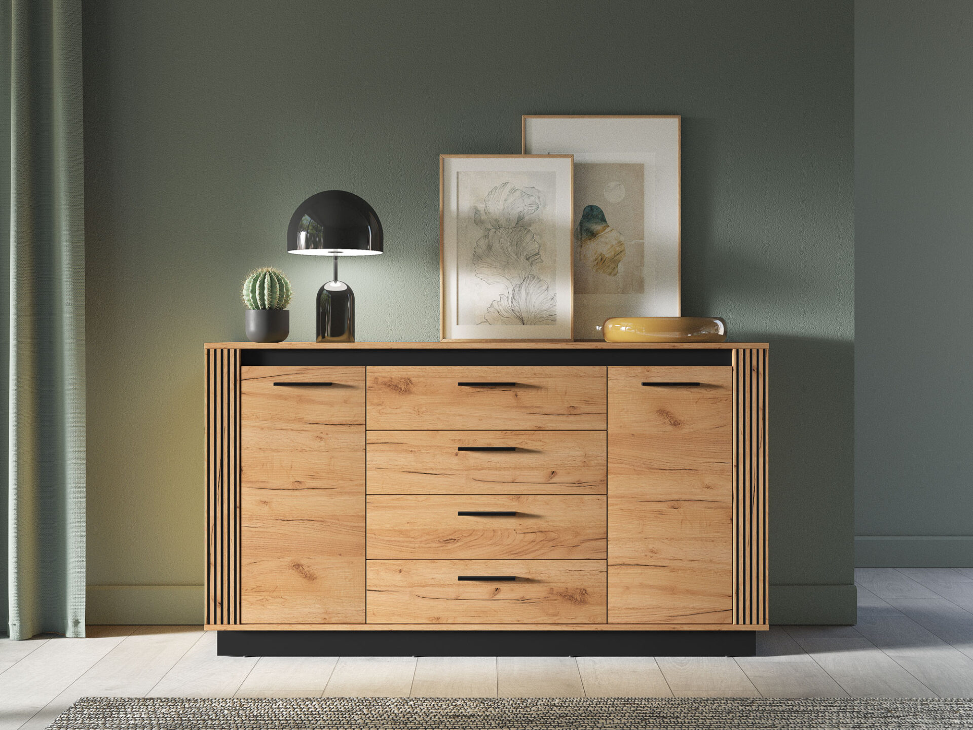 Didelė komoda „Urso 06“ – puikus daiktų laikymo sprendimas. Už kiekvienų durelių lentyna padalija erdvę į du erdvius skyrius. Šie skyriai puikiai tinka drabužiams, rankšluosčiams ir patalynei laikyti. Keturi gilūs stalčiai suteikia daug vietos dokumentams, staltiesėms ar kitiems namų tekstilės gaminiams. Ši komoda bus puikus jūsų svetainės ar miegamojo papildymas. Platus stalviršis – puiki vieta elegantiškoms vazoms, kelionių suvenyrams ar kitiems mėgstamiems daiktams eksponuoti. „Urso 06“ dizainas derina klasikinį ąžuolo rašto stilių su moderniu juodų elementų pavidalu. Originalūs, frezuoti įdėklai pabrėžia unikalų visų „Urso“ kolekcijos gaminių charakterį.