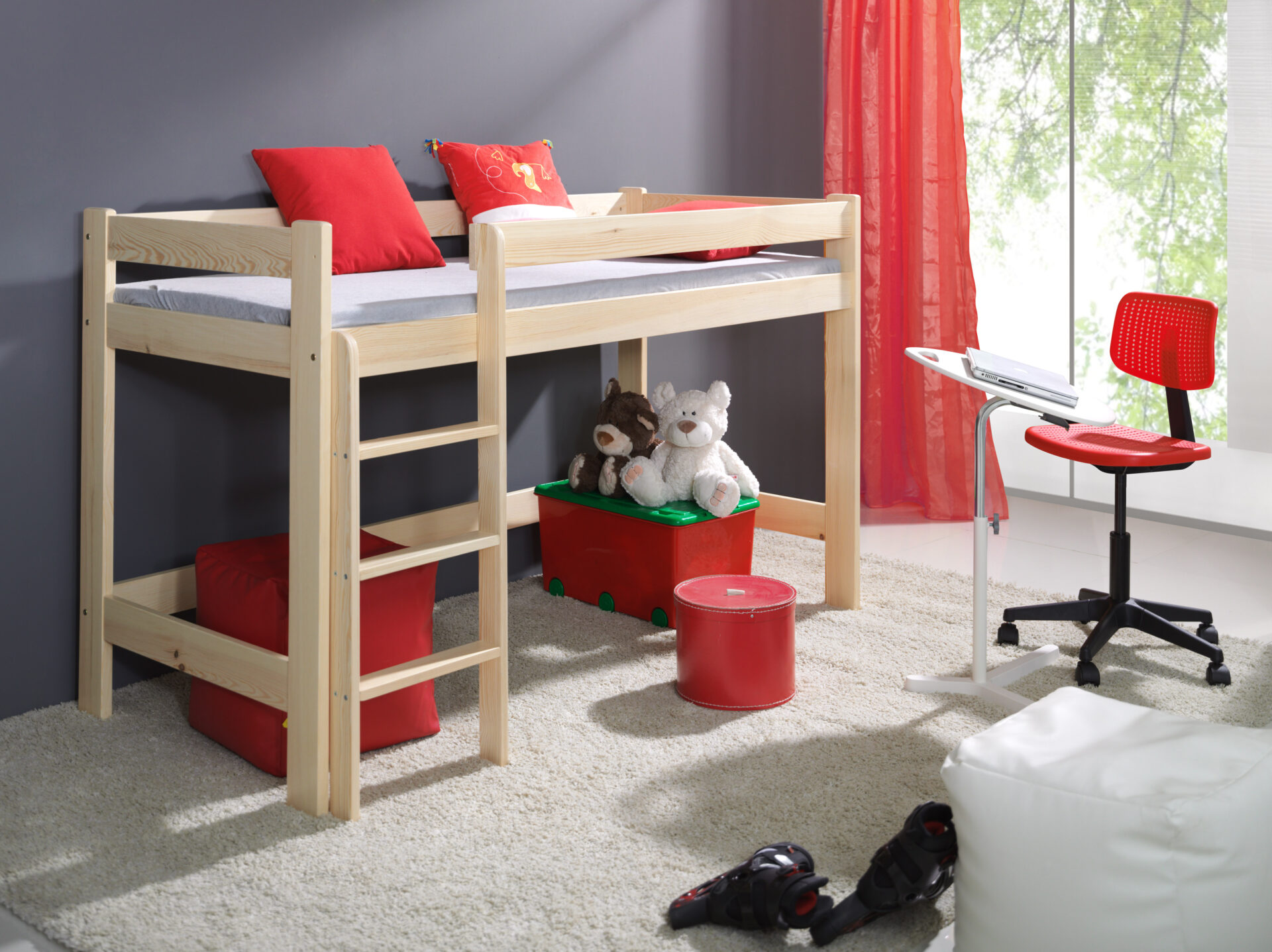 Vaikiška antresolė „Laura“ dviaukštė lova pagaminta iš pušies medienos, kuri kruopščiai tikrinama dėl patvarumo ir saugumo.