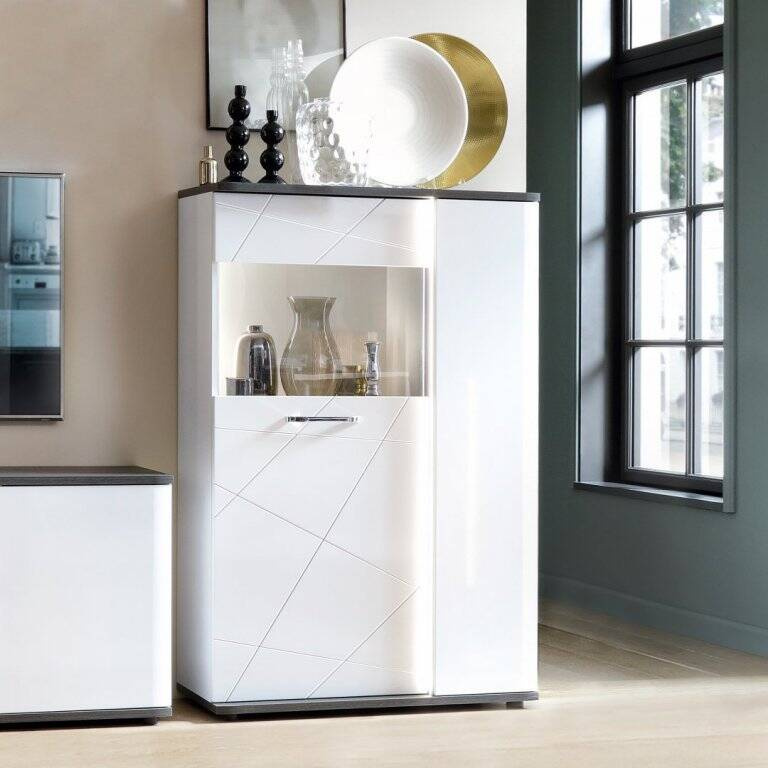 Atnaujinkite savo interjerą klase ir modernia elegancija su „Venezia VENV02R“ 2 durų vitrina, kurioje subtiliai dera balta, juoda „Vicenza“ ąžuolo medienos ir aukštos kokybės medžiagos. Šis elegantiškas baldas – puikus pasirinkimas tiems, kurie vertina tradicinį funkcionalumą ir modernų dizainą. 91,1 cm pločio, 140,5 cm aukščio ir 40 cm gylio „Venezia“ vitrina siūlo tobulą elegancijos ir praktiškumo pusiausvyrą. Sukurta siekiant optimizuoti erdvę, ji lengvai tilps tiek erdviame valgomajame, tiek mažoje svetainėje. Laminuotos medžio drožlių plokštės korpusas kartu su MDF fasadais, padengtais blizgia PVC plėvele, užtikrina ilgalaikį patvarumą ir estetinį patrauklumą. Spalvų gama ypač traukia akį – elegantiška, šilta „Vicenza“ ąžuolo medienos spalva, derinama su klasikine balta ir sodria juoda spalvomis, sukuria kontrastą, kuris traukia akį ir suteikia interjerui charakterio. Metalinės rankenos puikiai papildo minimalistinį dizainą, sukurdamos darnią visumą. Švelniai užsidarantys vyriai užtikrina patogų kasdienį naudojimą, o plastikinės kojelės – stabilumą ant bet kokio paviršiaus.