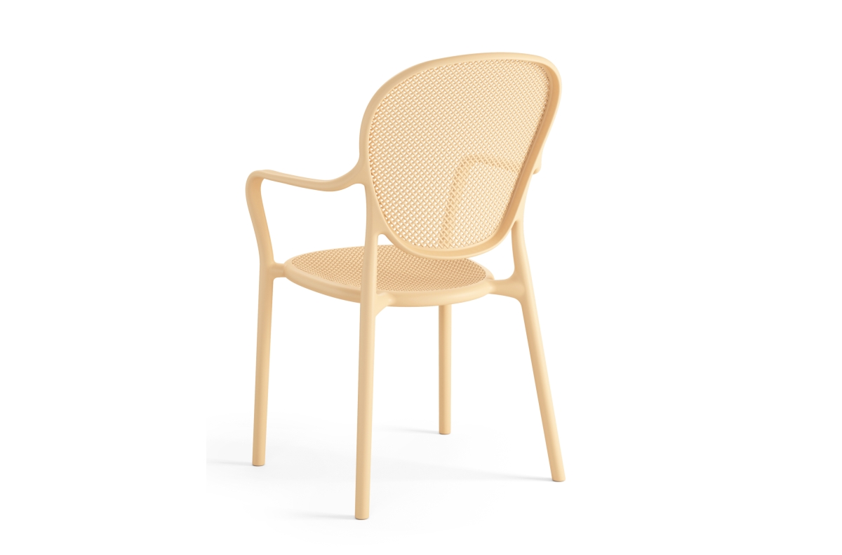 Išskirtinis šios kėdės bruožas – ažūrinis atlošas ir sėdynė, užtikrinantys puikią oro cirkuliaciją ir komfortą šiltomis dienomis. Apvalios atlošo ir porankių linijos suteikia baldui elegancijos, kartu užtikrindamos ergonomišką atramą ir komfortą.