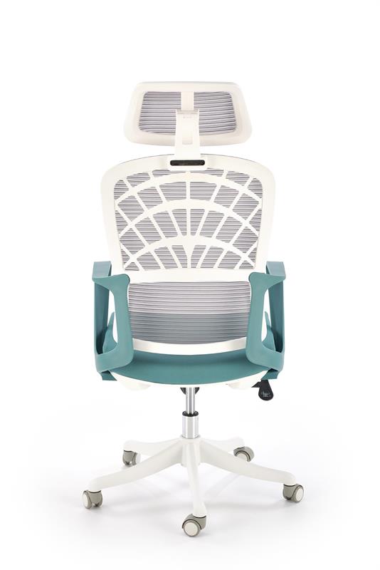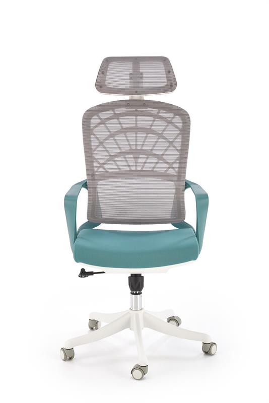 Matmenys: 59/59/115-121/45-51 cm; Pakreipimo mechanizmas / reguliuojama galvos atrama, audinys / tinklelis, spalva: turkio / balta