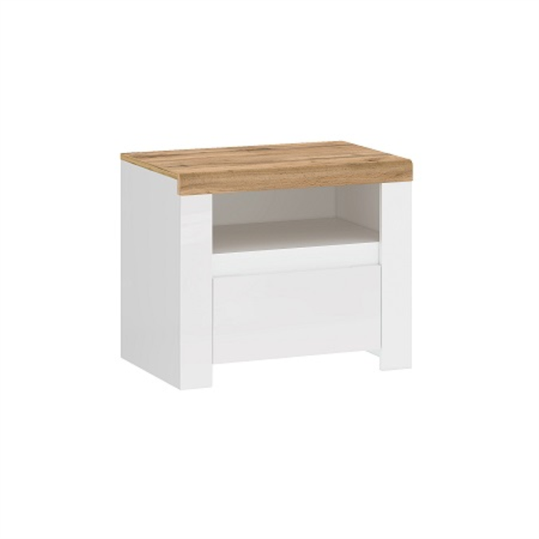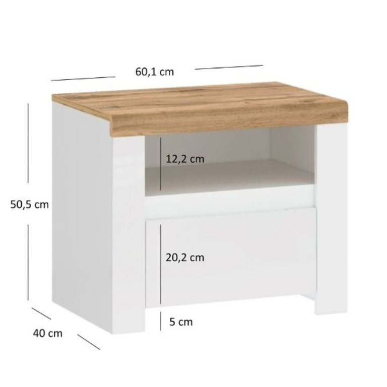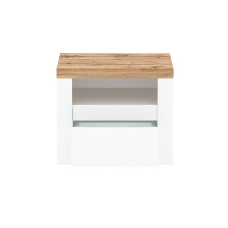 Naktinis staliukas yra labai praktiškas baldas miegamajam ar paauglio kambariui. Ant jo visi reikalingi daiktai yra lengvai pasiekiami šalia lovos. Šis baltas naktinis staliukas iš VIGO kolekcijos turi stalčių ir lentyną, puikiai tinkančius laikyti miego reikmenis, tokius kaip telefonas, vaistai, knygos ir kt. „Wotan Oak“ apdaila viršuje puikiai tinka žadintuvui ar naktinei lempai. VIGO naktinis staliukas patenkins kiekvieną modernaus stiliaus entuziastą, vertinantį klasikinį paprastumą.