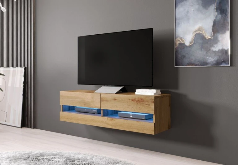 Prie sienos pakabinamas televizoriaus staliukas standartiškai turi mėlyną LED apšvietimą.