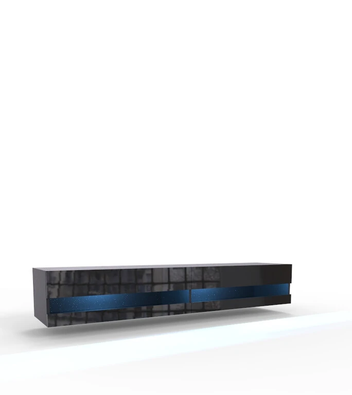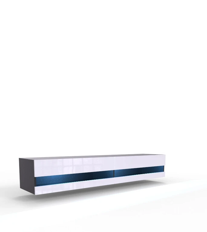 Prie sienos pakabinamas televizoriaus staliukas standartiškai turi mėlyną LED apšvietimą.