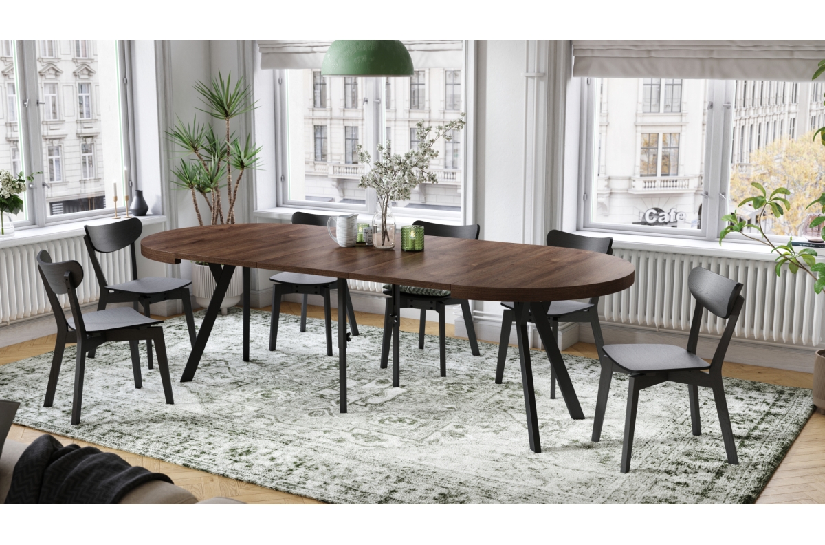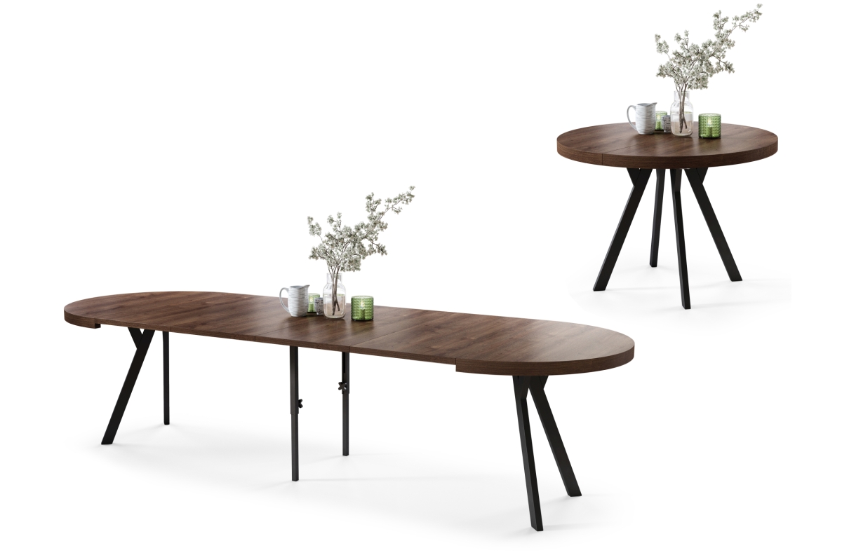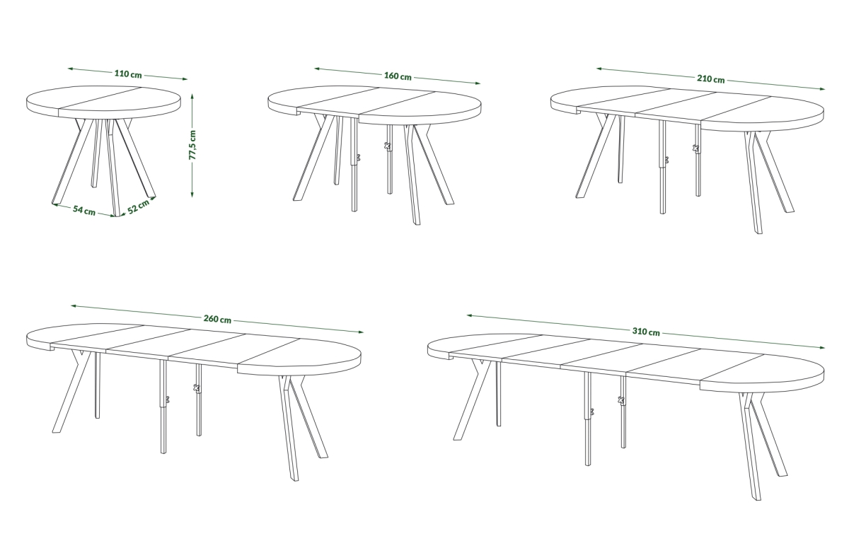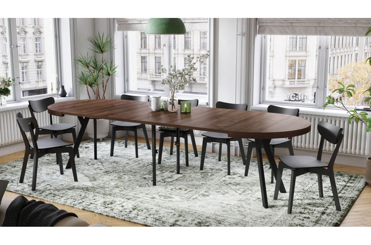 PLOTIS 110 / 160 / 210 / 260 / 310 cm, GYLIS 110 cm, AUKŠTIS 77,5 cm, ĮDĖKLŲ SKAIČIUS 4 vnt. x 50 cm (laikyti atskirai) VIRŠAUS FORMA Apvali, FUNKCIJA Ištraukiamas stalviršis, PAVIRŠIUS Matinis, STILIUS Loft / Industrial, SVORIS SU PAKUOTE 96 kg