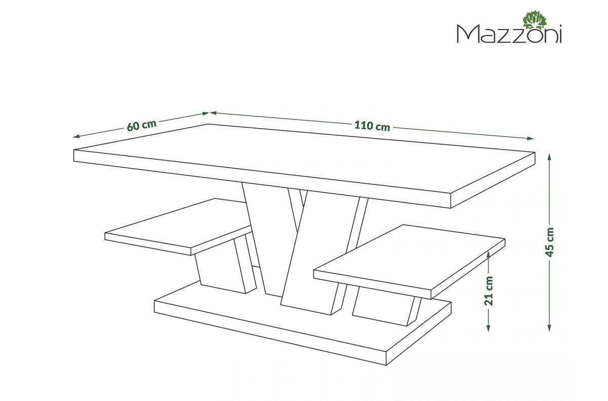 Stalas pagamintas iš 28 mm storio matinės medžio drožlių plokštės, laminuotos iš abiejų pusių, o lentynų storis – 18 mm. Visas gaminys apdailintas 1 mm ABS kraštais.
