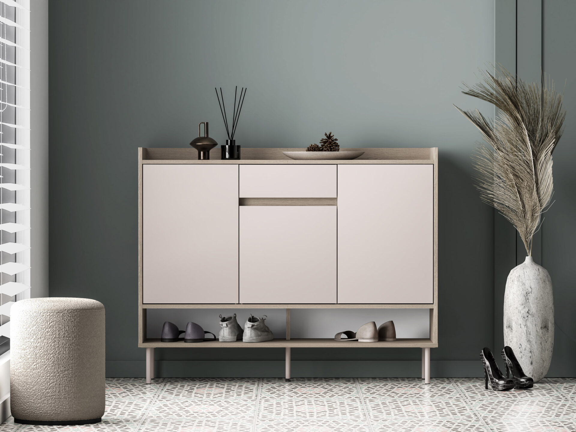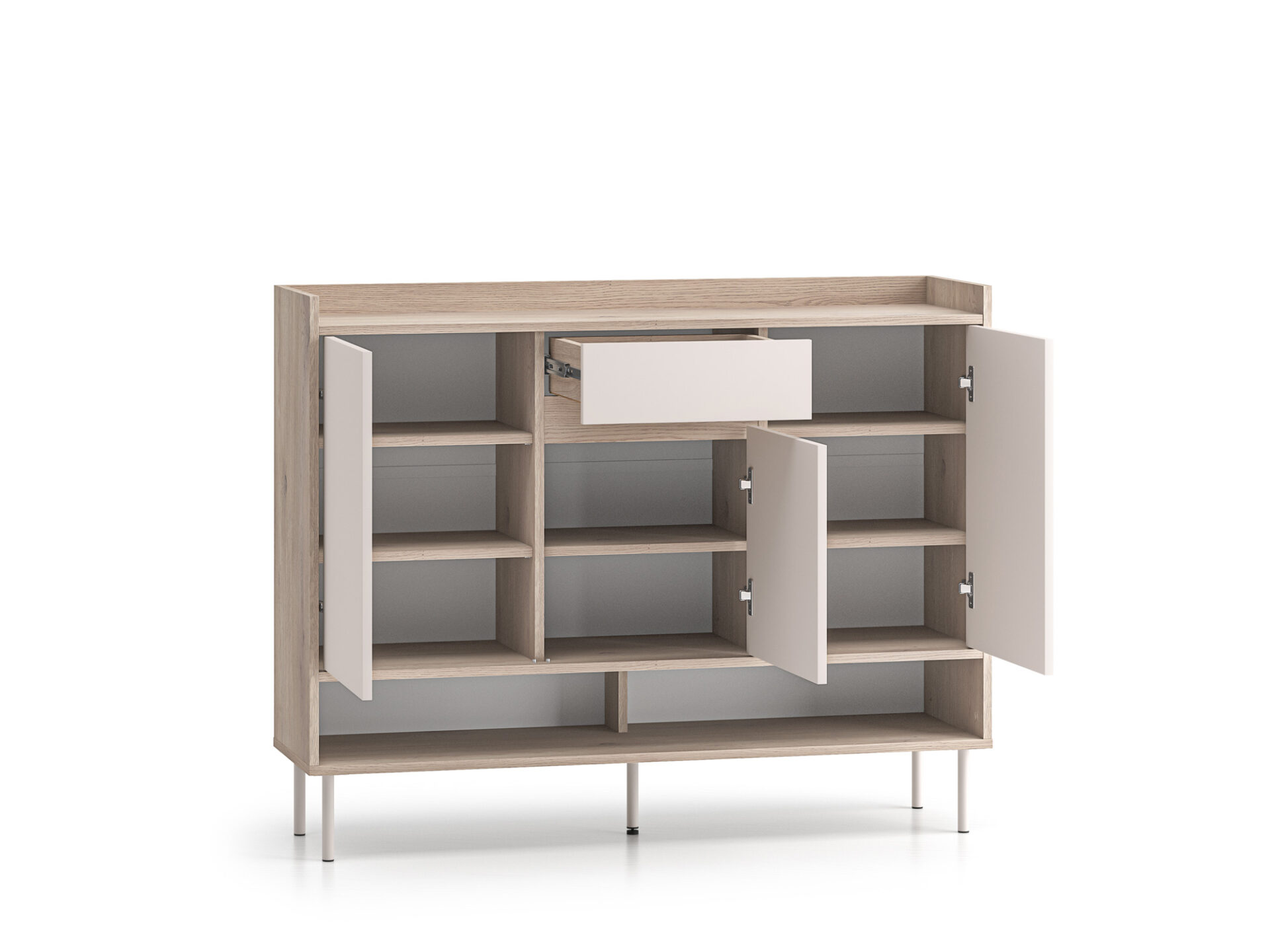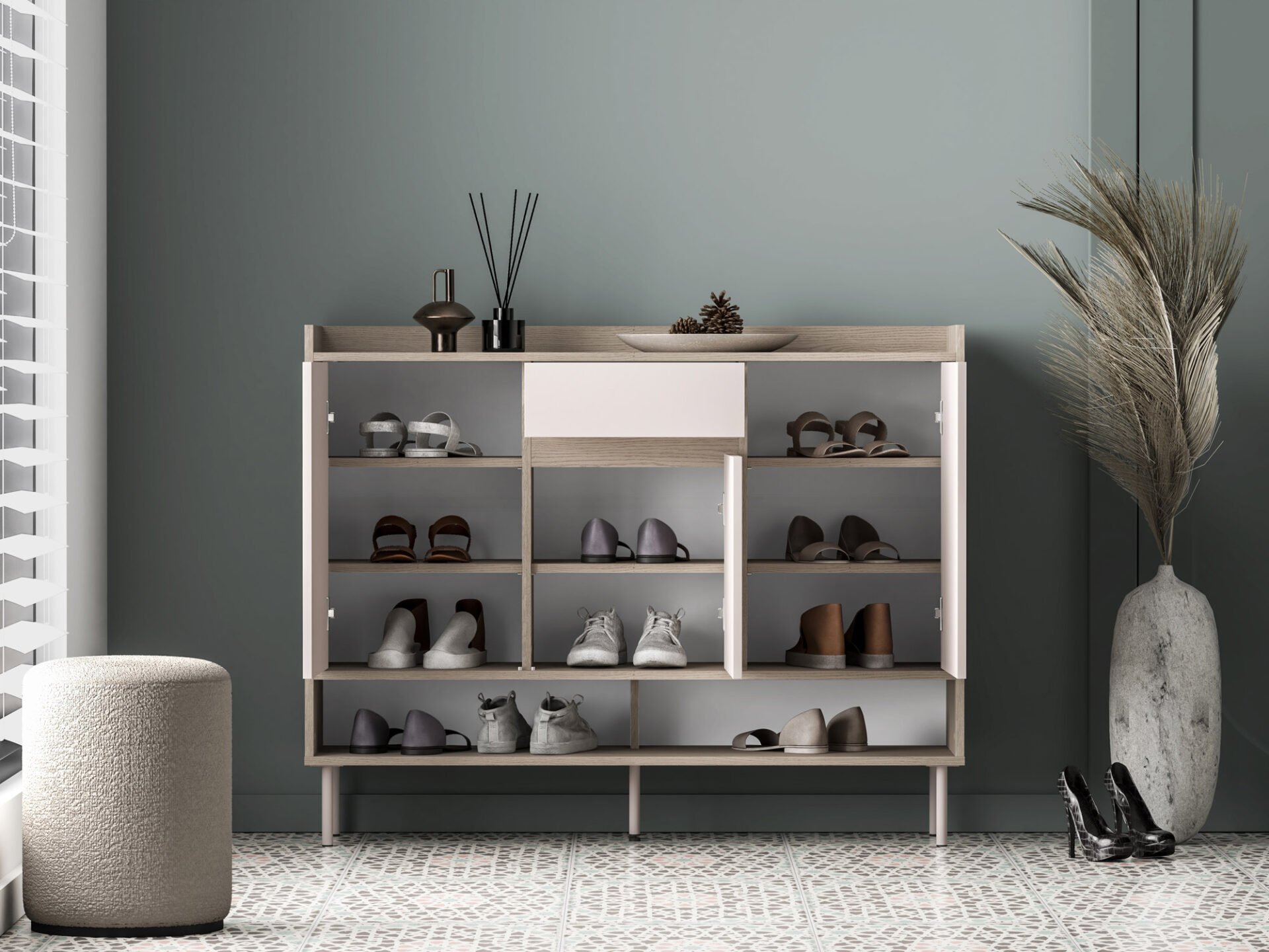 Batų spintelė „Voco 02“ – erdvus ir elegantiškas baldas jūsų prieškambariui. Joje yra aštuoni rakinami skyriai batams laikyti ir mažas stalčius kasdieniams niekučiams ar automobilio raktams. Žemesnis stalviršis yra stilingas ir praktiškas – raktai ar dokumentai niekada nepaliks spintelės. Apatinėje dalyje yra plati, atvira lentyna, leidžianti lengvai laikyti kasdienius batus ir išlaikyti tvarką.