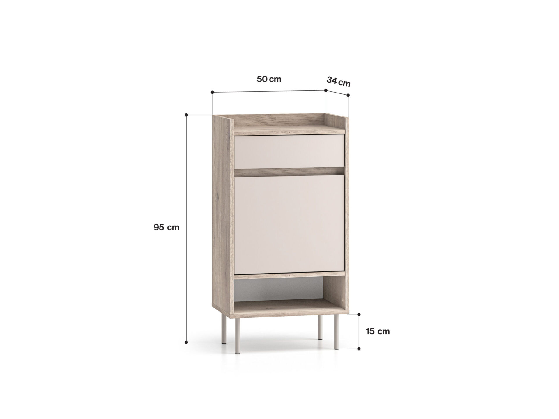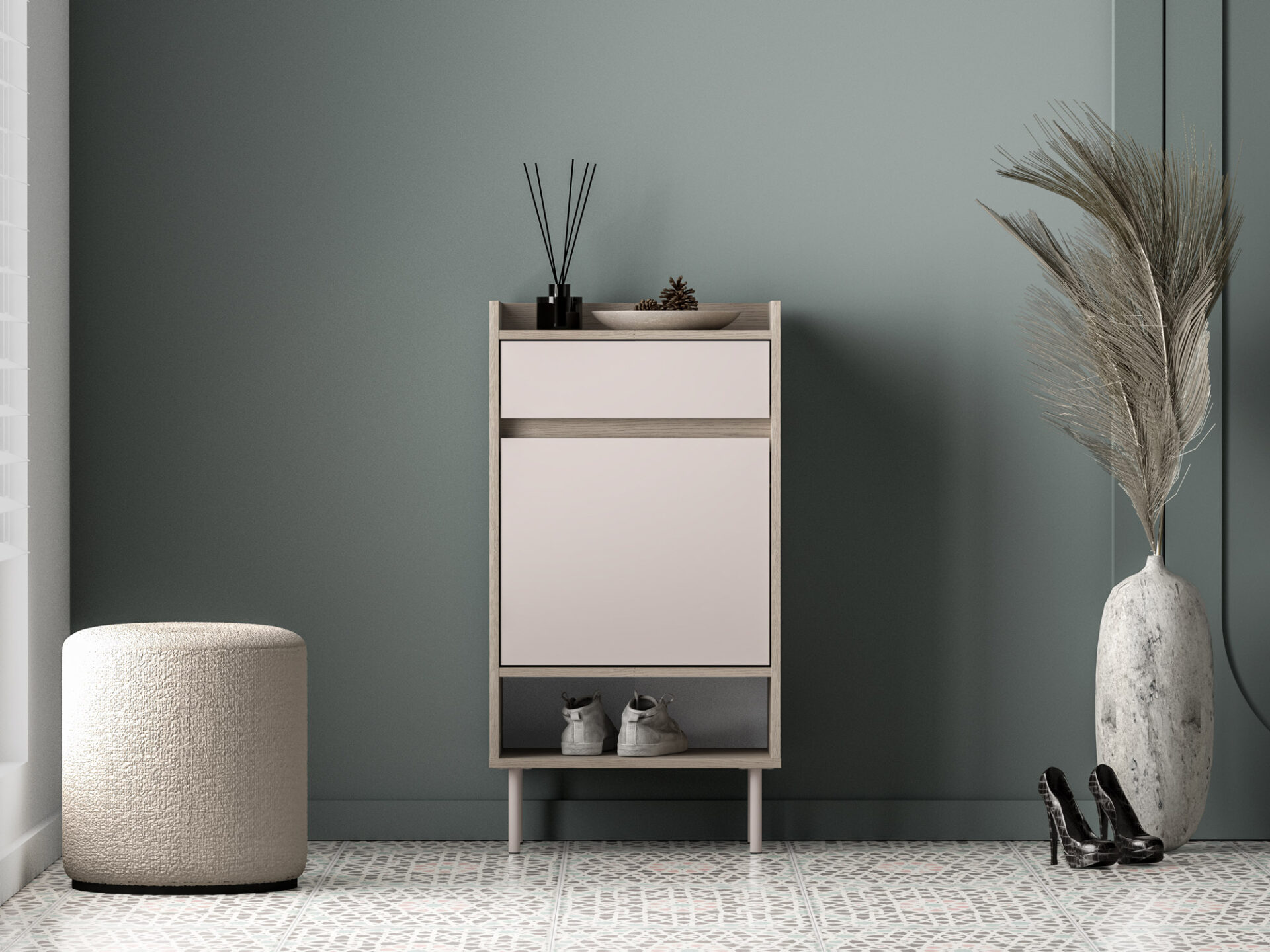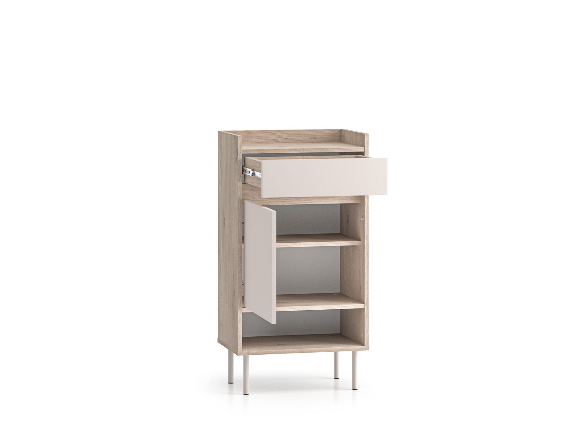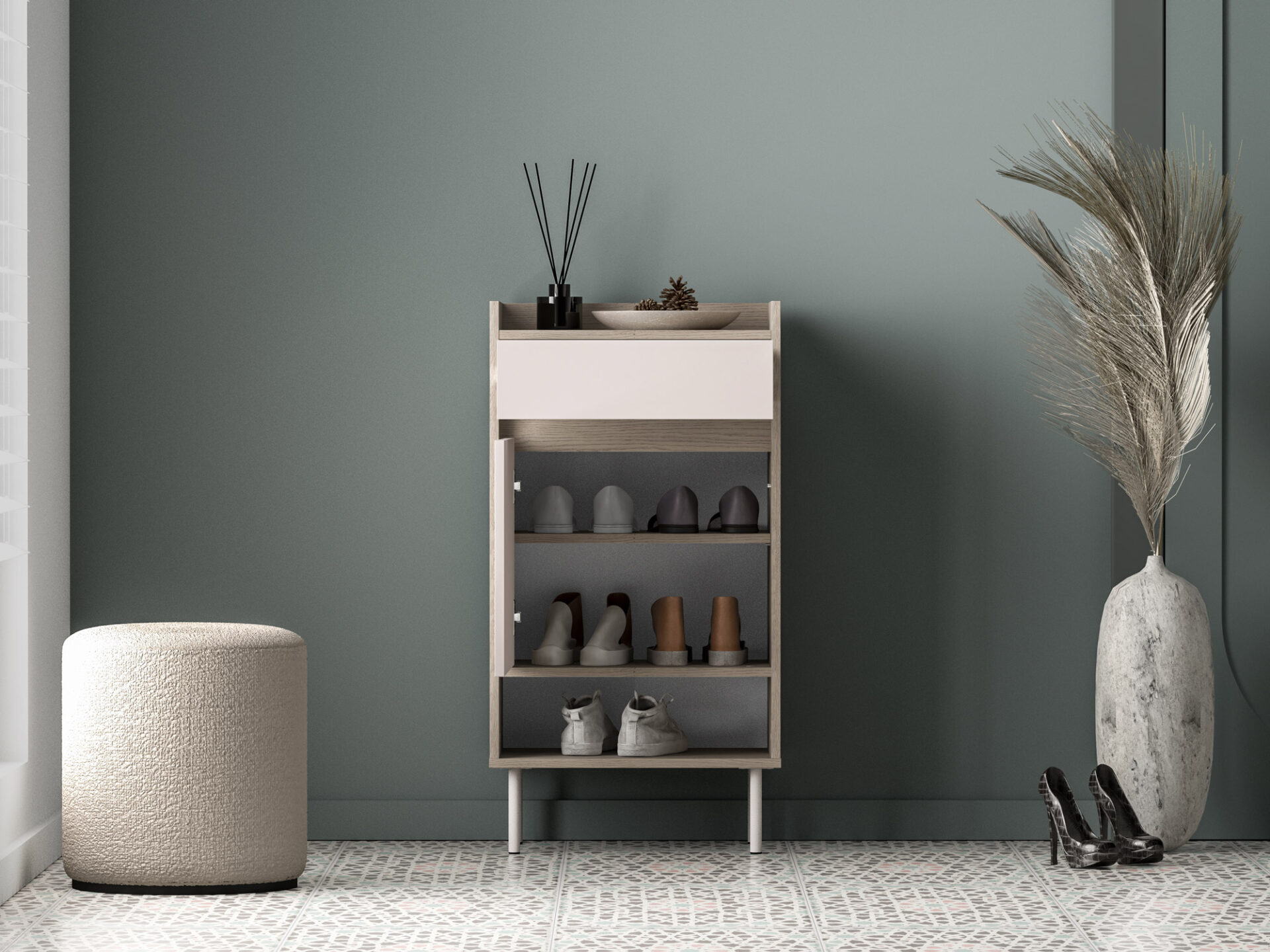 Batų spintelė „Voco 04“ – puikus sprendimas bet kokiam prieškambariui. Joje yra du erdvūs, rakinami skyriai, puikiai tinkantys batams laikyti. Erdvus stalčius viršuje suteikia pakankamai vietos raktams ar kasdieniams dokumentams. Žemesnis stalviršis yra stilingas ir praktiškas – raktai ar dokumentai niekada nenukris už komodos. Apatinėje dalyje yra plati, atvira lentyna, leidžianti lengvai laikyti kasdienius batus ir išlaikyti tvarką.