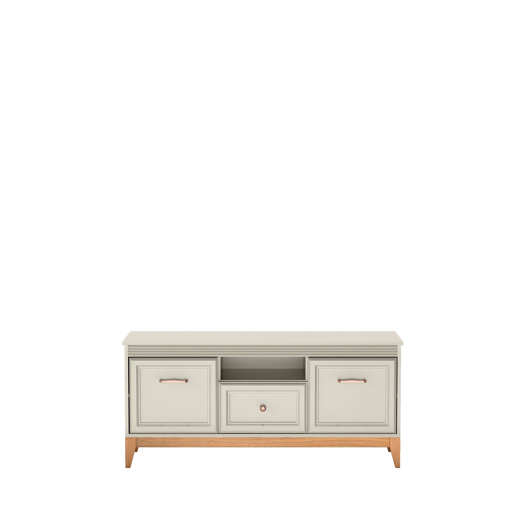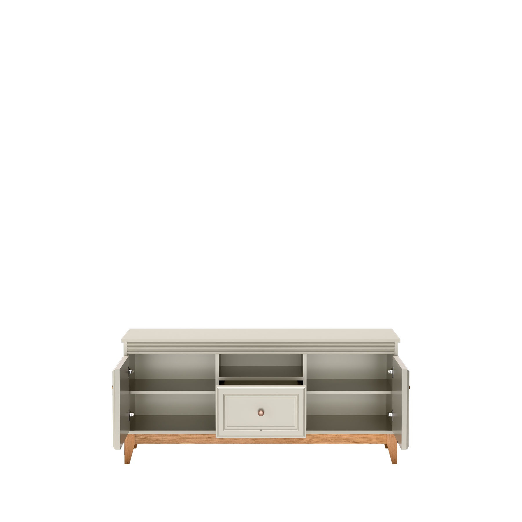 „WINDSOR-8“ – tai unikalus televizoriaus staliukas, kuriame gražiai dera elegancija ir naujausios tendencijos. Subtilus kašmyro spalvų derinys ir subtilios detalės paverčia jį tikru bet kokio interjero akcentu. Šių subtilių atspalvių derinys su natūralaus medžio kojelėmis suteikia baldui šilumos ir jaukumo, sukurdamas atpalaiduojančią erdvę, palankią bendroms akimirkoms su šeima ir draugais. Ieškodami tobulos vietos televizoriui ir kitiems multimedijos įrenginiams, verta apsvarstyti „WINDSOR-8“. Jis ne tik suteikia pakankamai vietos visiems jūsų reikalingiems daiktams, bet ir žavi savo estetika bei dėmesiu detalėms. Aukštos kokybės medžiagos, naudojamos jo konstrukcijoje, tokios kaip MDF ir laminuota plokštė, garantuoja patvarumą ir lengvą priežiūrą, todėl staliukas yra puikus sprendimas bet kokiems namams. Verta paminėti, kad „WINDSOR-8“ puikiai derės tiek moderniame, tiek minimalistiniame, tiek klasikiniame interjere, todėl tai universalus baldas. Klasikinis dizainas kartu su modernia apdaila paverčia jį puikiu bet kurios gyvenamosios erdvės papildymu. Be to, metalinės vario spalvos rankenos suteikia prabangos ir elegancijos, be to, yra praktiškos ir funkcionalios.