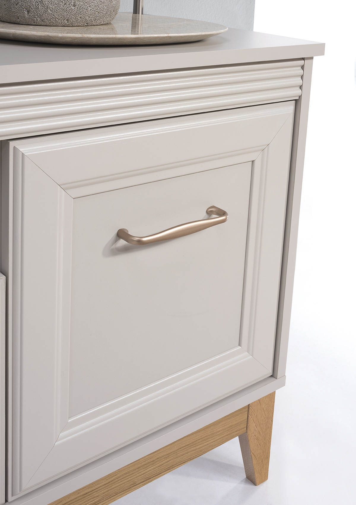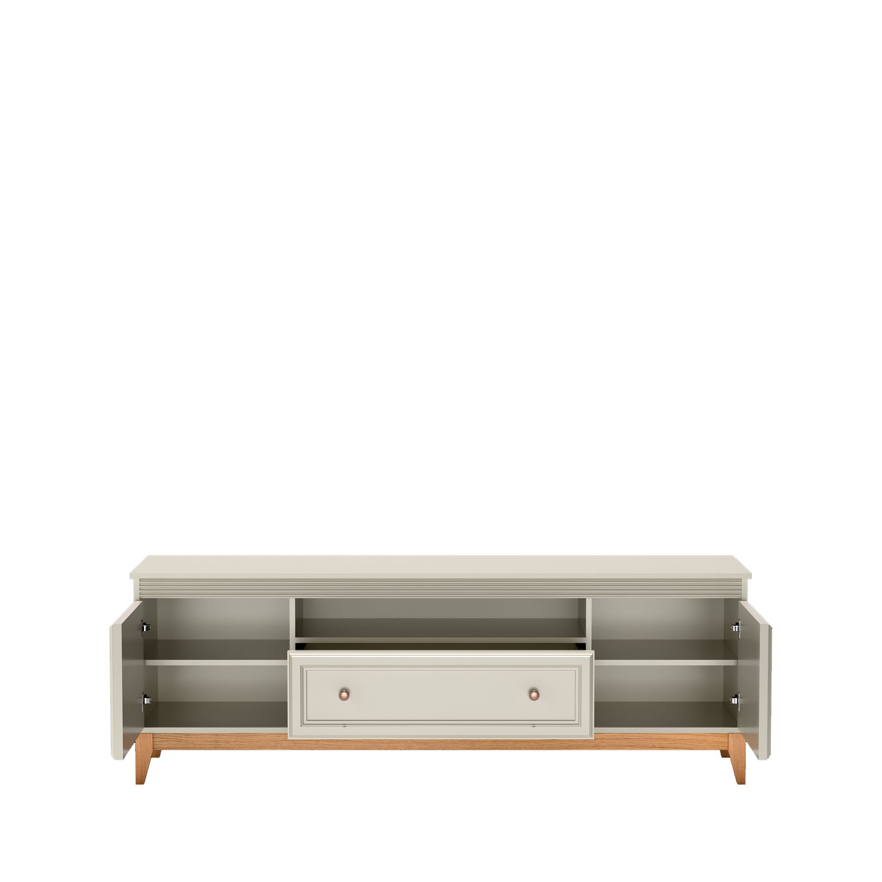 „WINDSOR-9“ televizoriaus staliukas – tai tobulas elegancijos ir funkcionalumo derinys, suteikiantis jūsų svetainei unikalų charakterį. Klasikinis dizainas, apdailintas prabangia kašmyro spalva, suteikia interjerui subtilios harmonijos ir jaukumo. Dėl kruopščiai atrinktų medžiagų, įskaitant natūralaus ąžuolo medines kojeles, šis baldas tampa ne tik estetiniu akcentu, bet ir stabiliu elementu kasdieniam naudojimui. „WINDSOR-9“ televizoriaus staliuko vidus buvo sukurtas atsižvelgiant į praktinį erdvės išnaudojimą. Erdvios lentynos suteikia daugybę elektronikos ir namų aksesuarų laikymo galimybių. Nesvarbu, ar turite filmų kolekciją, ar žaidimų rinkinį, šis baldas tikrai leis jums laikyti viską, ko norite, po ranka, tuo pačiu išlaikant tvarką jūsų svetainėje. Kitas akį traukiantis bruožas – subtilios vario atspalvio rankenėlės, kurios suteikia bendram dizainui modernumo. Būtent tokios detalės daro įtaką galutiniam vizualiniam efektui, todėl „WINDSOR-9“ spintelė tampa ryškiu elementu, galinčiu tapti bet kurio svetainės dizaino traukos centru. Vario akcentai gražiai kontrastuoja su subtilia korpuso spalva, sukurdami harmoningą kompoziciją.