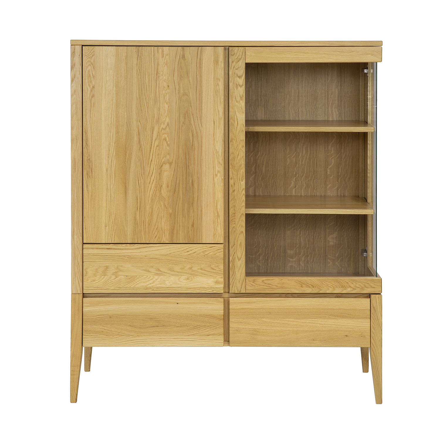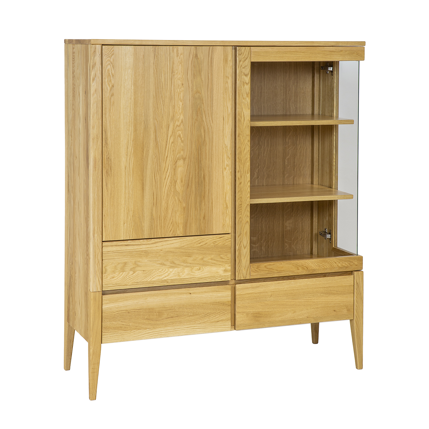 Ąžuolinė vitrina KW337 – stilingas baldas, kuris jūsų interjerui suteiks klasikinio retro stiliaus. Pagaminta iš aukščiausios kokybės natūralaus ąžuolo medienos, spintelė yra ne tik patvari ir ilgaamžė, bet ir graži bei funkcionali. Ąžuolinė vitrina pasižymi žemu profiliu ir vienomis stiklinėmis durelėmis, leidžiančiomis elegantiškai eksponuoti mėgstamiausius daiktus. Dvi vidinės lentynos leidžia tvarkingai laikyti įvairius aksesuarus, papuošalus ir knygas. Spintelėje taip pat yra trys ištraukiami stalčiai, suteikiantys dar daugiau vietos smulkiems daiktams ir vietos daiktams susidėti, paslėptai už medinių durelių. Ąžuolinės vitrinos KW337 retro stilių pabrėžia aukštos kojelės, kurios suteikia baldui elegancijos ir lengvumo. Jų patvari konstrukcija garantuoja stabilumą ir patikimą naudojimą daugelį metų. Ąžuolinė vitrina KW337 puikiai dera su kitais RETRO kolekcijos baldais. Atidarius stiklines dureles, vitrinos plotis pasikeičia nuo S120 iki S146.