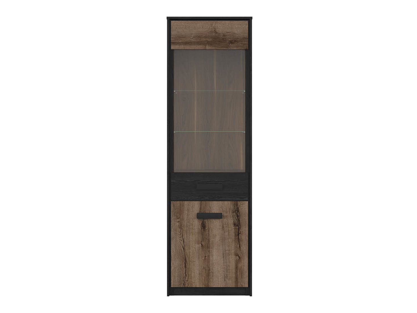 Apatinė spintelės dalis yra spintelė su praktiška lentyna, puikiai tinkančia, pavyzdžiui, staltiesėms ir takelių laikymui. Visa vitrina, kuri atlieka kolonos funkciją, pasižymi netradiciniu dizainu. Dviejų spalvų – šilto abatijos ąžuolo ir elegantiško juodo ąžuolo – derinys suteikia baldui unikalų charakterį. Medžio raštas, paryškintas juodos spalvos kontrastu, svetainėje sukurs raminančią atmosferą, palankią poilsiui ir ilgiems pokalbiams. Šis spalvų derinys puikiai dera su moderniu ar lofto stiliaus estetika.