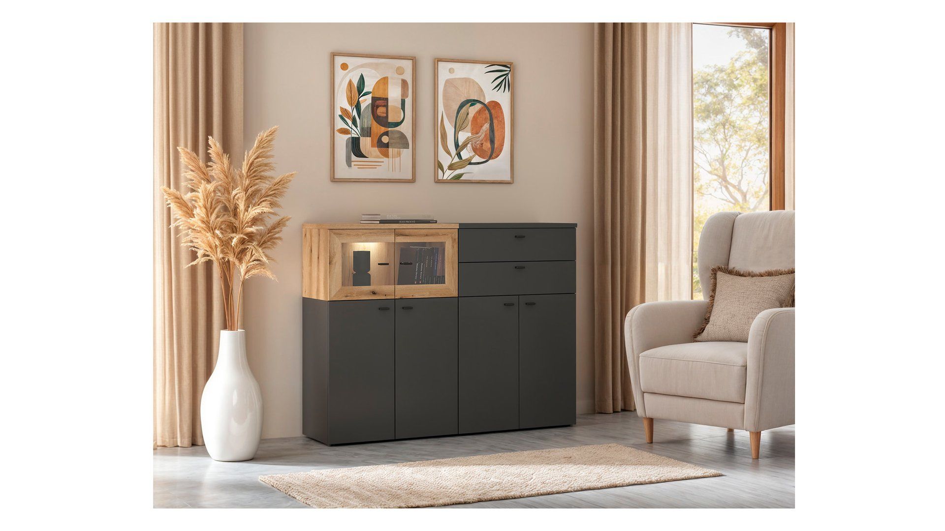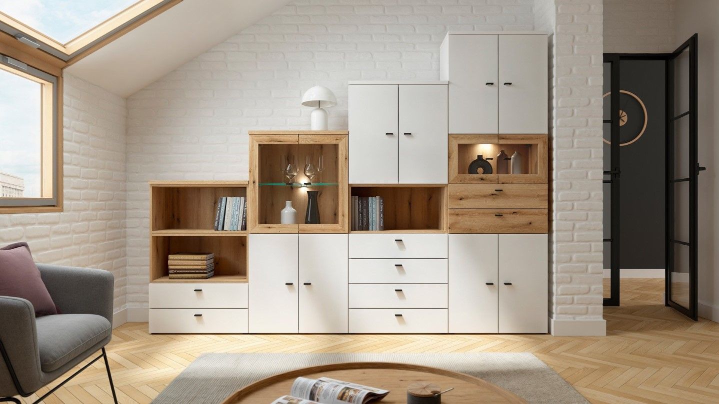 Žema ’System 64“ dvidurė vitrina – modulinis interjeras pagal jūsų stilių. „System 64“ kolekcija – tai modernūs moduliniai baldai, kurių plotis – 64 cm, o aukštis – 32 arba 64 cm. Visų modulių gylis – 35 cm, todėl juos galima laisvai derinti į komodas, televizoriaus spinteles, knygų lentynas ar sienines spinteles. Kiekvieną elementą galima pastatyti ant grindų, pakabinti ant sienos arba sudėti vieną ant kito, kad būtų sukurtos darnios kompozicijos. „System 64“ siūlo tris madingas spalvas: baltą, ąžuolo ir grafito. Spintelėms galima įsigyti LED apšvietimą, kuris sustiprina interjero charakterį, o 64, 128 ir 192 cm ilgio stalviršiai leidžia kurti elegantiškus derinius. Funkcionalumas ir konfigūracija: Žema „System 64“ dvidurė vitrina sujungia paprastą formą su elegancija ir praktiškumu. Kompaktiški 64 x 32 x 35 cm matmenys ir maksimali 10 kg keliamoji galia daro ją idealiai tinkančią svetainėms, valgomiesiems, miegamiesiems ar paauglių kambariams. Už dviejų durelių yra vieta dekoratyviniams daiktams – stikliniams indams, stalo įrankiams, papuošalams ar puodelių kolekcijai – laikyti. Papildomai pasirenkamas LED apšvietimas subtiliai apšviečia interjerą, suteikdamas kambariui jaukią atmosferą. Vitrina pagaminta iš patvarios laminuotos plokštės, atsparios kasdieniam naudojimui ir lengvai valomos. Švelnaus uždarymo sistema padidina komfortą, o juodos metalinės rankenos suteikia baldui modernų charakterį. Galimybė montuoti ant sienos leidžia sukurti šviesų ir erdvų išdėstymą, pritaikytą individualiems poreikiams. Specialios savybės: Matmenys: 64 x 32 x 35 cm, Dvi durelės su vieta dekoratyviniams daiktams, Maksimali apkrova: 10 kg, Patvari laminuota plokštė, atspari kasdieniam naudojimui, Švelnaus uždarymo sistema didesniam komfortui, Juodos metalinės rankenos pabrėžia modernų stilių, Galimos spalvos: Balta, „Evoke Oak“, Grafito, Galimi montavimo variantai: Pastatoma ant grindų arba montuojama ant sienos, Papildomas LED apšvietimas vitrinos viduje, Pridedami sieniniai tvirtinimo elementai, Spalva: „Coast Evoke Oak“. Santrauka: Žema dviejų durų vitrina „System 64“ – tai puikus estetikos, funkcionalumo ir lengvos formos derinys. Tai puikiai papildys modernaus interjero dizainą, suteikdama harmonijos ir stiliaus.