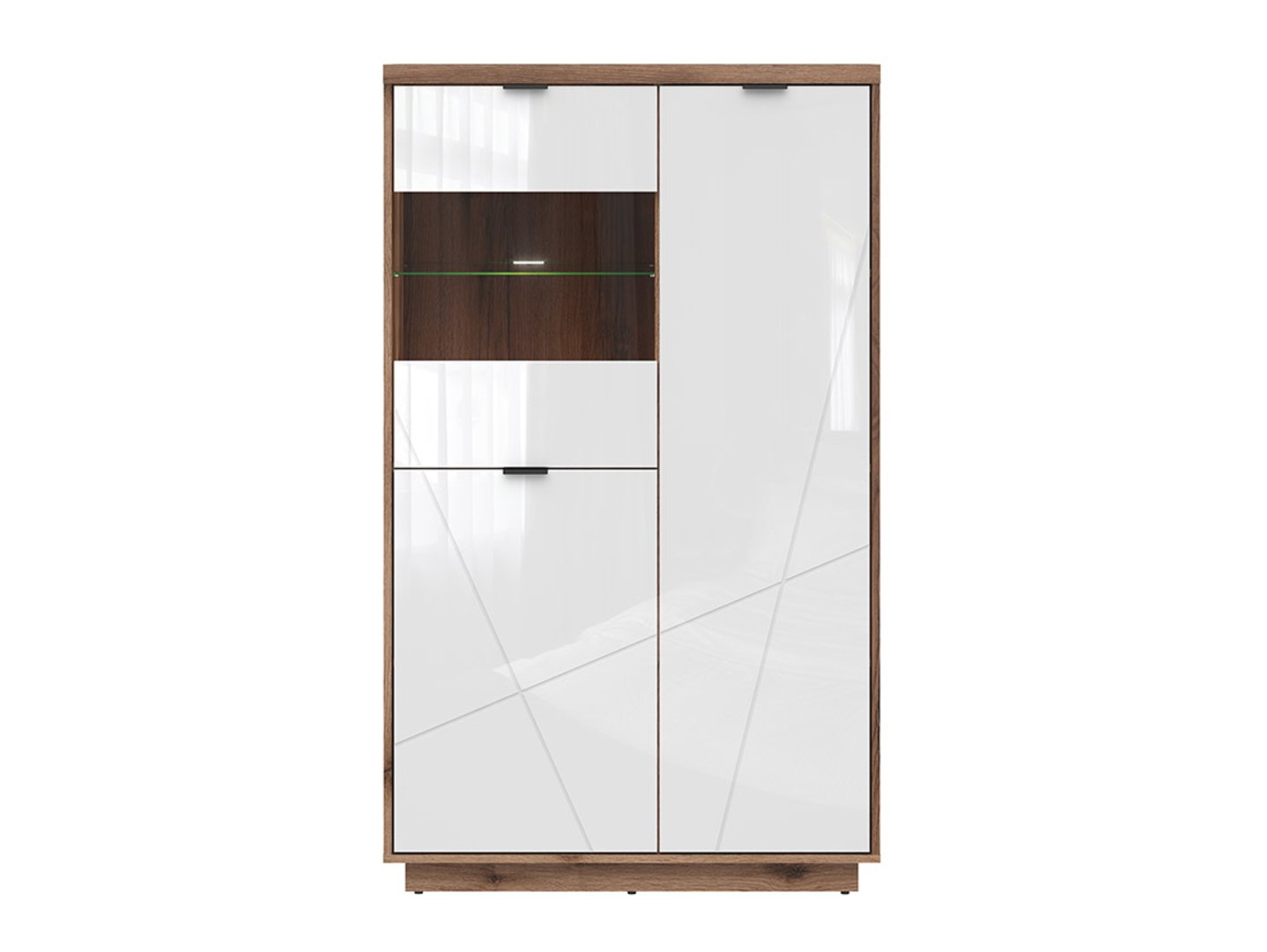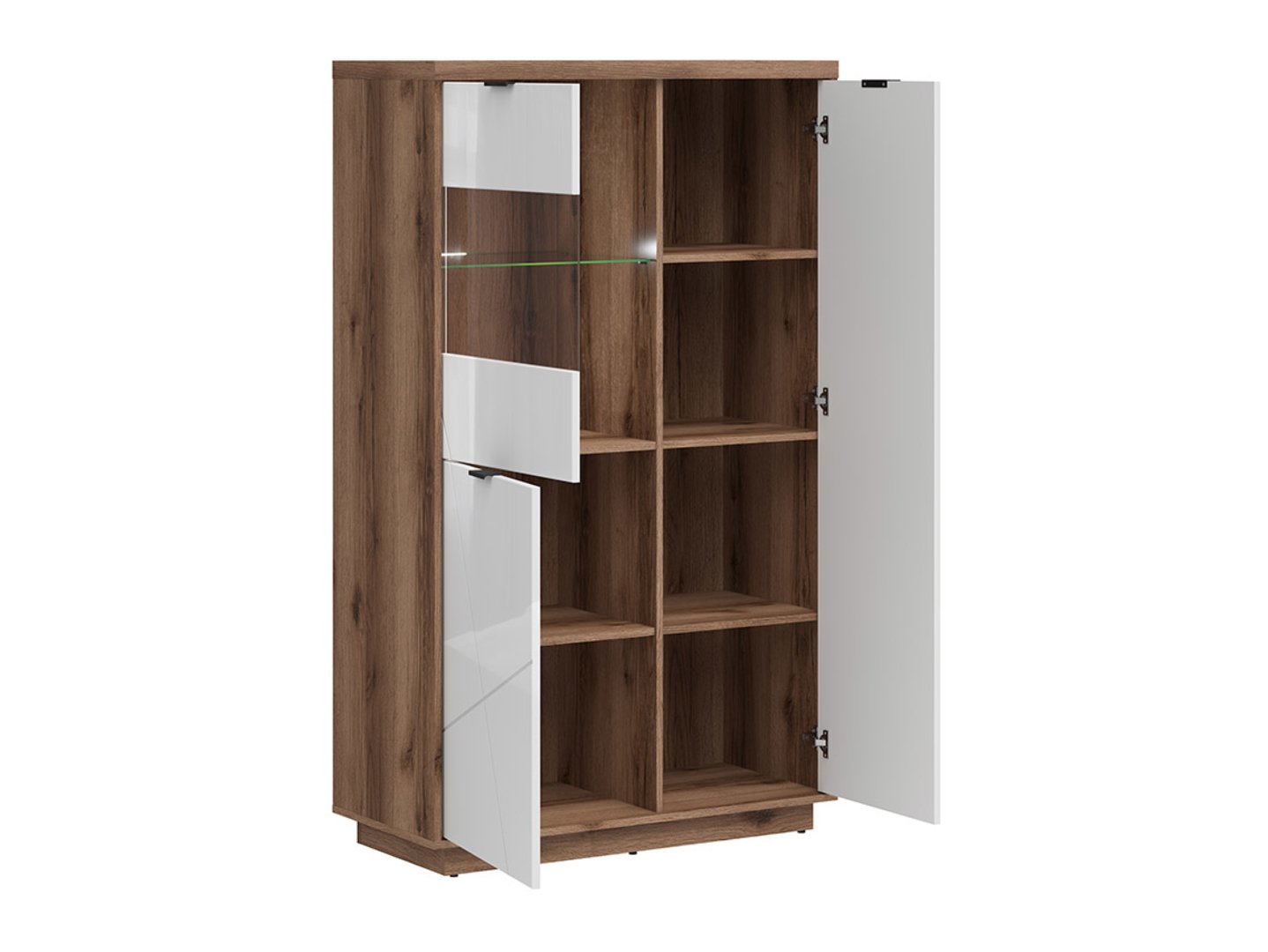 Būkite pirmas aprašęs “FORN žema dvidurė vitrina su stiklu, 94 cm, tamsus Delano ąžuolas / blizgi balta”