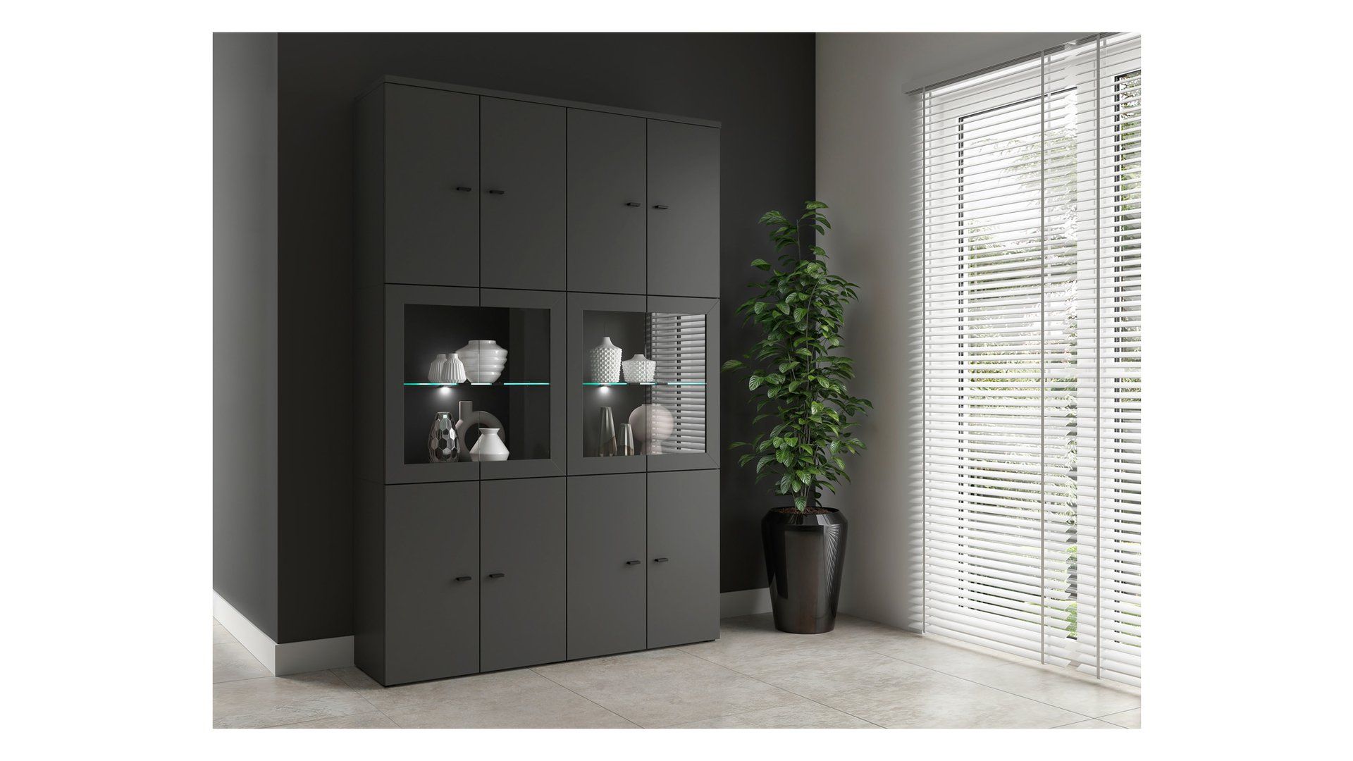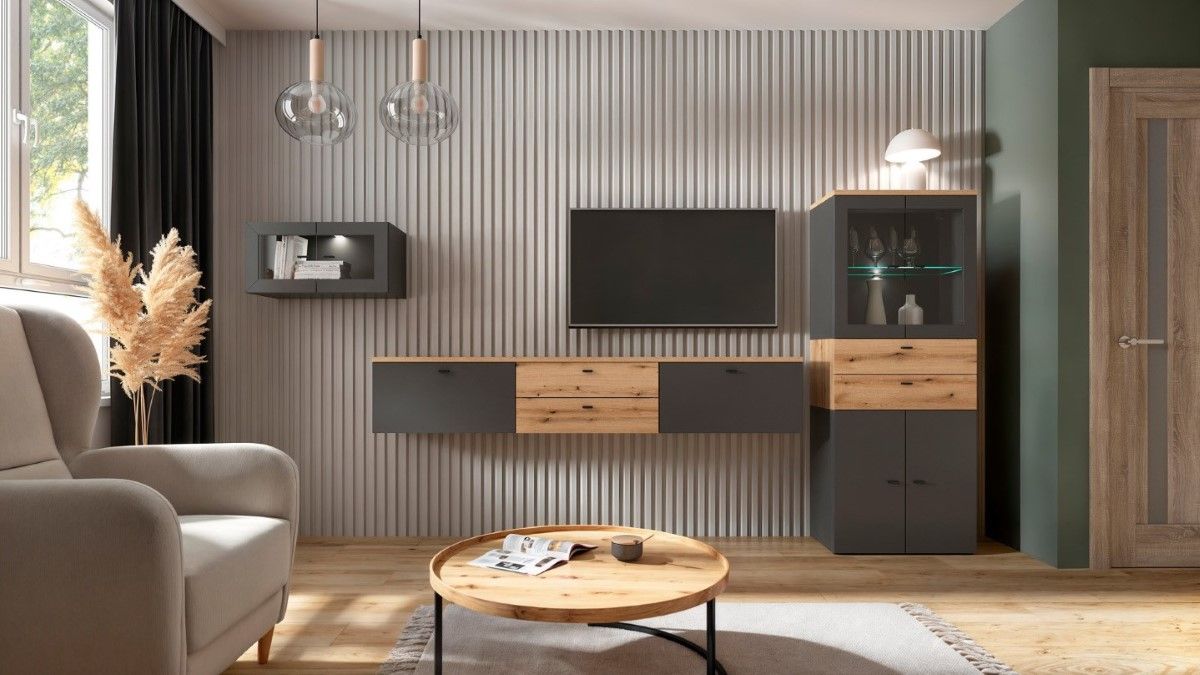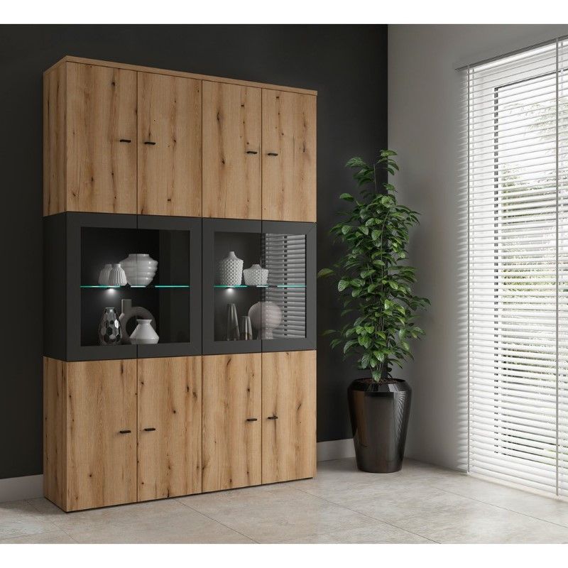 „System 64“ dviejų durų vitrina – modulinis interjeras pagal jūsų stilių. „System 64“ kolekcija – tai modernus modulinių baldų komplektas, kurio plotis – 64 cm, o aukštis – 32 arba 64 cm. Visų elementų gylis yra 35 cm, todėl galite kurti darnias ir funkcionalias kompozicijas, tokias kaip komodos, vitrinos, televizoriaus staliukai ir knygų lentynos. Modulius galima sudėti atskirai, kabinti ant sienos arba sudėti vieną ant kito, o galimos spalvos – balta, ąžuolo spalvos ir grafito – suteikia platų išdėstymo galimybių spektrą. „System 64“ taip pat leidžia vitrinose įmontuoti LED apšvietimą, kuris subtiliai išryškina ekspoziciją, o 64, 128 ir 192 cm ilgio stalviršiai leidžia sukurti elegantiškus ir funkcionalius komplektus. Funkcionalumas ir konfigūracija: „System 64“ dviejų durų vitrina derina modernų dizainą ir funkcionalumą. 64 x 64 x 35 cm matmenys ir maksimali 12 kg apkrova puikiai tiks įvairiuose kambariuose – nuo svetainės ir valgomojo iki biuro ar miegamojo. Stikliniai fasadai leidžia estetiškai eksponuoti porcelianą, stiklo dirbinius, knygas ar suvenyrus, kartu apsaugodami juos nuo dulkių. Viduje stiklinė lentyna suteikia lengvumo ir elegancijos. Patvari medžio drožlių plokštės konstrukcija atlaiko kasdienį dėvėjimąsi, o subtilios rankenos pabrėžia modernų baldų charakterį. Papildomas LED apšvietimas (galima įsigyti už papildomą mokestį) išryškina eksponuojamus daiktus ir sukuria malonią atmosferą. Ši vitrina puikiai atrodo kaip atskiras baldas arba kaip didesnės „System 64“ sistemos dalis. Specialios savybės: Matmenys: 64 x 64 x 35 cm, Dvejos stiklinės durys elegantiškam vidaus eksponavimui, Stiklinė lentyna lengvam dizainui, Maksimali apkrova: 12 kg, Papildomas LED apšvietimas ekspozicijai paryškinti, Patvari baldų lenta, atspari kasdieniam naudojimui, Subtilios, modernios rankenos, Galimos spalvos: Balta, „Evoke Oak“, Grafito, Galima įsigyti laisvai pastatomą arba montuojamą ant sienos konfigūraciją, Pridedami sieniniai tvirtinimo elementai, Grafito spalva. Santrauka: Dviejų durų „System 64“ vitrina yra stilingas baldas, kuriame derinamas daiktų laikymas ir elegantiškas mėgstamų daiktų pateikimas. Puikiai tinka moderniam interjerui, leidžia sukurti lengvumo ir klasės kupiną dizainą.
