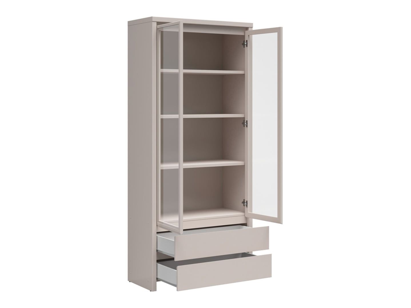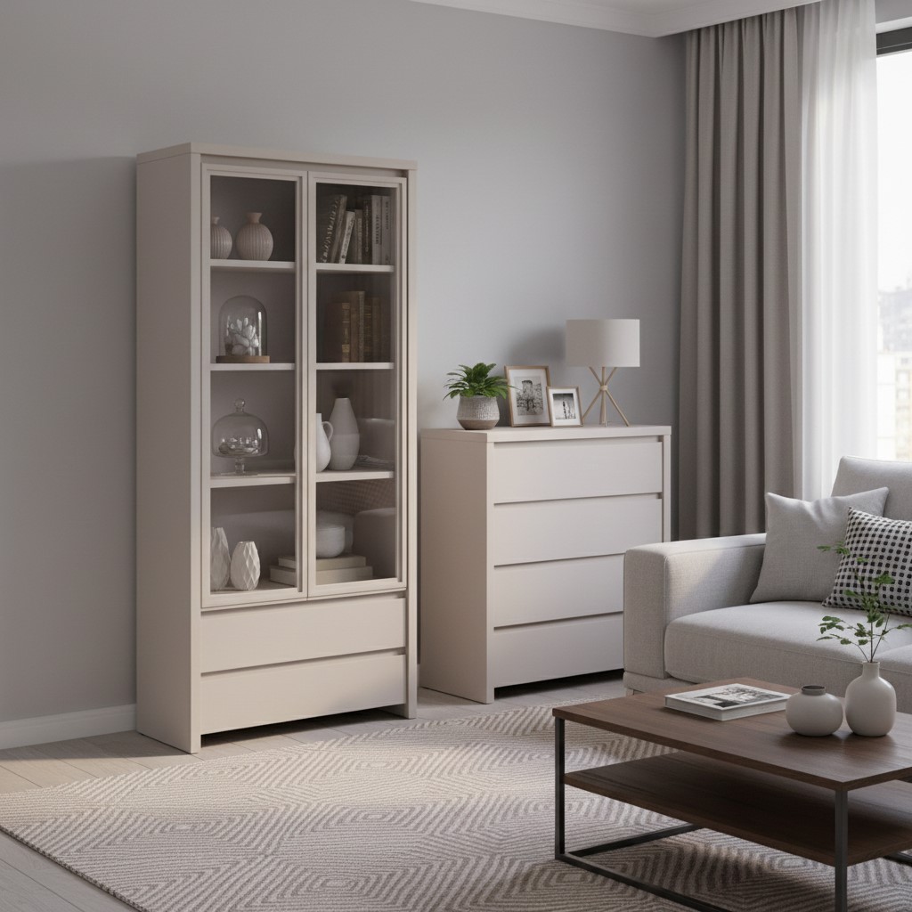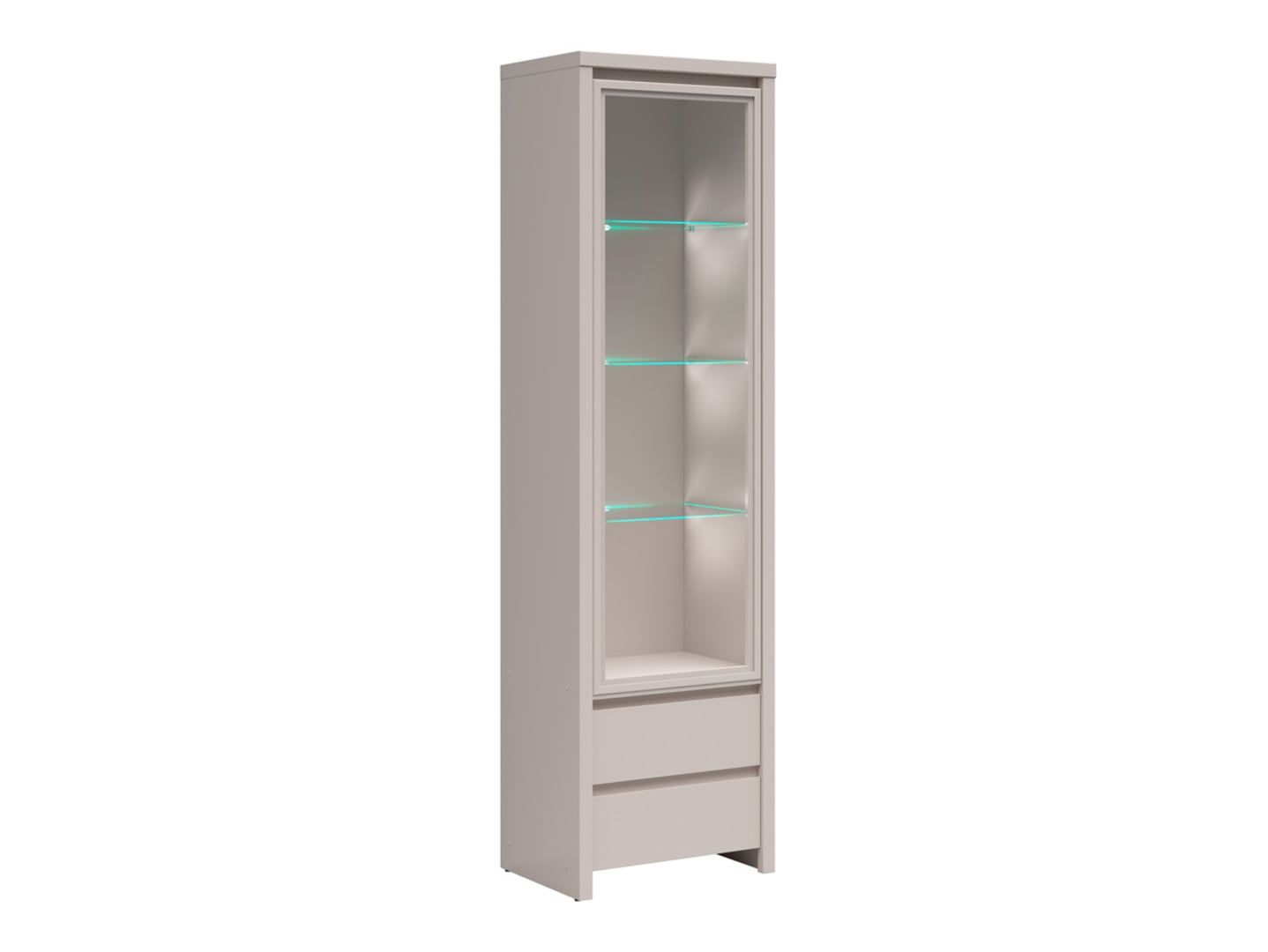 „Kaspian“ kašmyro vitrina – elegantiško dizaino elegantiška vitrina. „Kaspian“ kašmyro vitrina puikiai tinka tiems, kurie nori derinti daiktų laikymą su estetiniu patrauklumu. „Kaspian“ kolekcija pasižymi paprastomis, nesenstančiomis formomis ir prislopintomis spalvomis, todėl ją lengva pritaikyti įvairiuose interjeruose. Dėl plono spintelės dizaino ji taip pat puikiai tinka mažesnėms erdvėms. Patogumas ir funkcionalumas: stiklinė dalis leidžia estetiškai eksponuoti dekoracijas, stiklinius indus ar knygas, kartu apsaugodama juos nuo dulkių. Grūdintas stiklas padidina saugumą ir ilgaamžiškumą. Apatinėje dalyje yra du praktiški stalčiai smulkiems daiktams laikyti ir tvarkai palaikyti. Fasadai be rankenėlių užtikrina patogų naudojimą ir pabrėžia modernų spintelės charakterį. Dizainas ir spalvos: subtiliai pastorintos šoninės pusės sustiprina spintelės struktūrą ir suteikia jai išskirtinę, tačiau lengvą išvaizdą. Kašmyro fanera suteikia interjerui elegancijos ir harmonijos, gerai dera tiek su šviesiais, tiek su tamsesniais aksesuarais. Vitriną galima papildomai aprūpinti energiją taupančiu LED apšvietimu, kuris efektyviai išryškina eksponuojamus daiktus. Specialios savybės: Plona vitrina su stikliniu eksponavimo paviršiumi, grūdintas stiklas didesniam saugumui, du erdvūs stalčiai apatinėje dalyje, modernaus charakterio fasadai be rankenėlių, subtiliai pastorinti šonai, kurie sutvirtina konstrukciją, pasirenkamas energiją taupantis LED apšvietimas, pagaminta iš kašmyro spalvos laminuotos plokštės, matmenys: 56 × 40,5 × 200,5 cm, galima derinti su kitais „Kaspian“ kolekcijos gaminiais. Santrauka: „Kaspian“ kašmyro vitrina yra funkcionalus ir elegantiškas baldas, leidžiantis patraukliai eksponuoti mėgstamus daiktus, kartu išlaikant tvarką praktiškų stalčių dėka. Dėl plonos formos, neutralių spalvų ir galimybės pridėti LED apšvietimą, vitrina puikiai tinka svetainei, valgomajam, biurui ar miegamajam, sukuriant darnią kompoziciją su kitais „Kaspian“ sistemos elementais.
