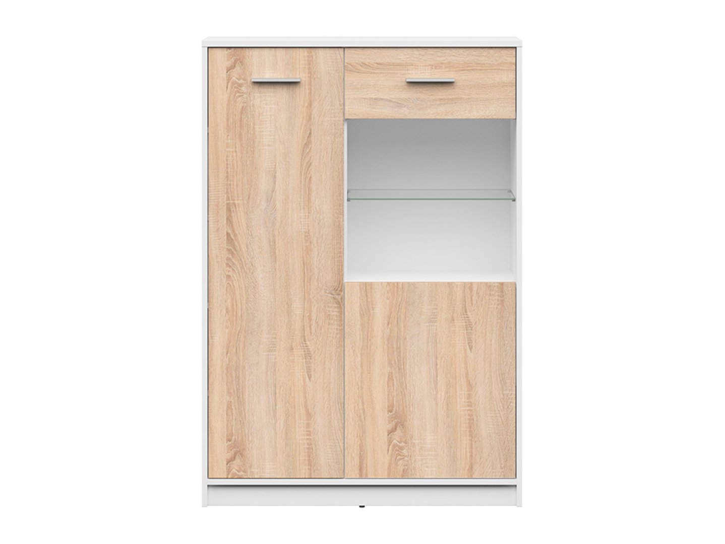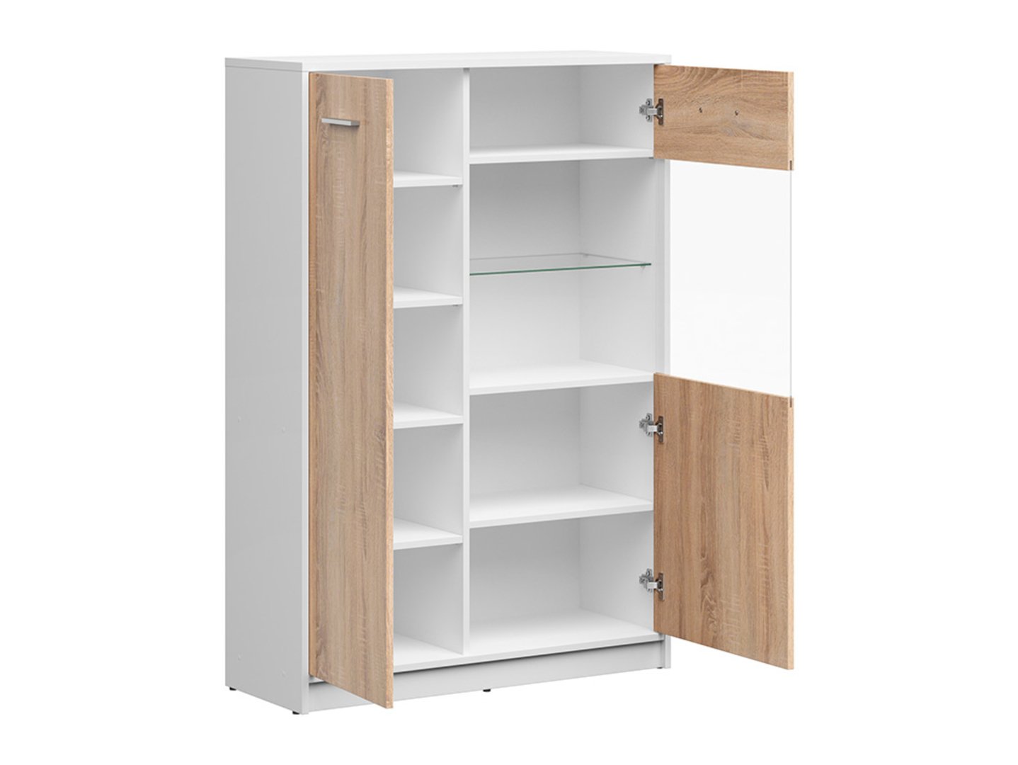 ’Nepo Plus“ vitrina – daugiafunkcionalumas klasikiniu stiliumi. Daugiafunkciniai baldai ypač populiarūs mažesniuose butuose. „Nepo Plus“ vitrina apjungia eksponavimą ir daiktų laikymą. Ši vitrina, tinkanti svetainėms, paauglių kambariams ar miegamiesiems, žavi savo paprasta forma ir universaliu dizainu. Jos matmenys – 90 x 131,5 x 34 cm – ir praktiški vidiniai padaliniai leidžia laikyti tiek dekoratyvinius, tiek praktiškus daiktus. „Nepo Plus“ vitriną sudaro: – trys vitrinos lentynos už stiklo, – du praktiški skyriai smulkiems daiktams, paslėpti už tvirto fasado, – du didesni skyriai dokumentams ar stalo įrankiams, taip pat už tvirto fasado. Įvairios spalvų parinktys – balta, Sonoma ąžuolo ir Monastery ąžuolo – suteikia plačias dizaino galimybes. Laminuotas vitrinos paviršius yra atsparesnis įbrėžimams ir lengvai valomas. Horizontalios rankenos palengvina prieigą prie turinio. Taip pat atsižvelgėme į naudotojų saugumą, naudodami patvarų grūdintą stiklą. Papildomai galima įsigyti LED apšvietimą, kuris pabrėš jūsų dekoro originalumą. Derinkite „Nepo Plus“ vitriną su kitais kolekcijos elementais, kad sukurtumėte funkcionalų interjerą, kuris bus universalus pagrindas jūsų mėgstamiausiems aksesuarams.