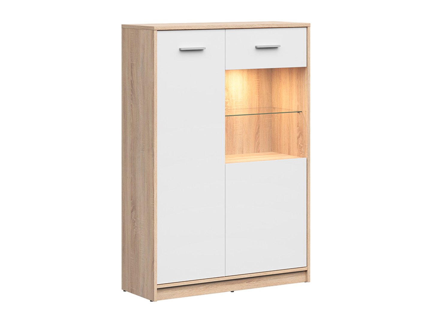 ’Nepo Plus“ vitrina – daugiafunkcionalumas klasikiniu stiliumi. Daugiafunkciniai baldai ypač populiarūs mažesniuose butuose. „Nepo Plus“ vitrina apjungia eksponavimą ir daiktų laikymą. Ši vitrina, tinkanti svetainėms, paauglių kambariams ar miegamiesiems, žavi savo paprasta forma ir universaliu dizainu. Jos matmenys – 90 x 131,5 x 34 cm – ir praktiški vidiniai padaliniai leidžia laikyti tiek dekoratyvinius, tiek praktiškus daiktus. „Nepo Plus“ vitriną sudaro: – trys vitrinos lentynos už stiklo, – du praktiški skyriai smulkiems daiktams, paslėpti už tvirto fasado, – du didesni skyriai dokumentams ar stalo įrankiams, taip pat už tvirto fasado. Įvairios spalvų parinktys – balta, Sonoma ąžuolo ir Monastery ąžuolo – suteikia plačias dizaino galimybes. Laminuotas vitrinos paviršius yra atsparesnis įbrėžimams ir lengvai valomas. Horizontalios rankenos palengvina prieigą prie turinio. Taip pat atsižvelgėme į naudotojų saugumą, naudodami patvarų grūdintą stiklą. Papildomai galima įsigyti LED apšvietimą, kuris pabrėš jūsų dekoro originalumą. Derinkite „Nepo Plus“ vitriną su kitais kolekcijos elementais, kad sukurtumėte funkcionalų interjerą, kuris bus universalus pagrindas jūsų mėgstamiausiems aksesuarams.