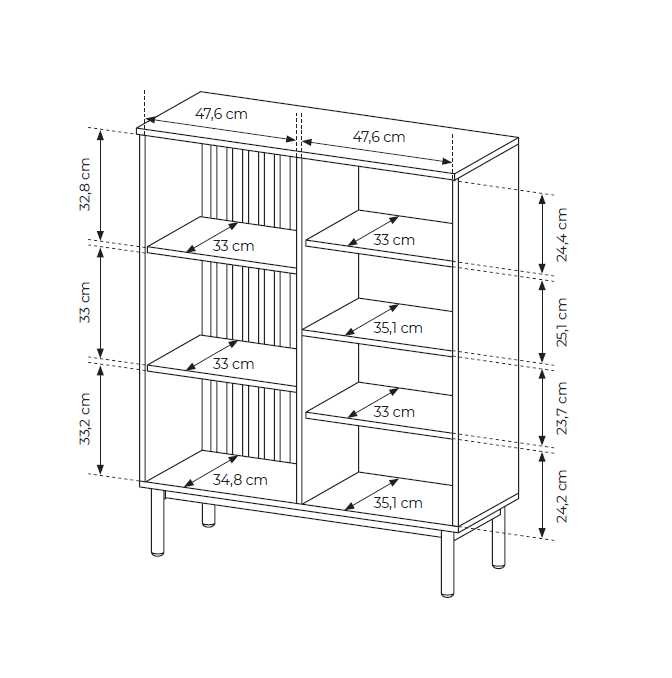 Žema „Lang“ vitrina – turi dvi stiklines spinteles su apšvietimu ir grotelių foną.