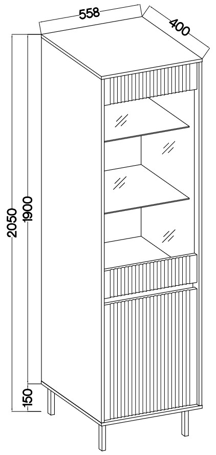 „Osaka 2D“ vitrina – turi du fasadus, vienas iš jų įstiklintas, su lentynomis už jų ir pasirenkamu apšvietimu.