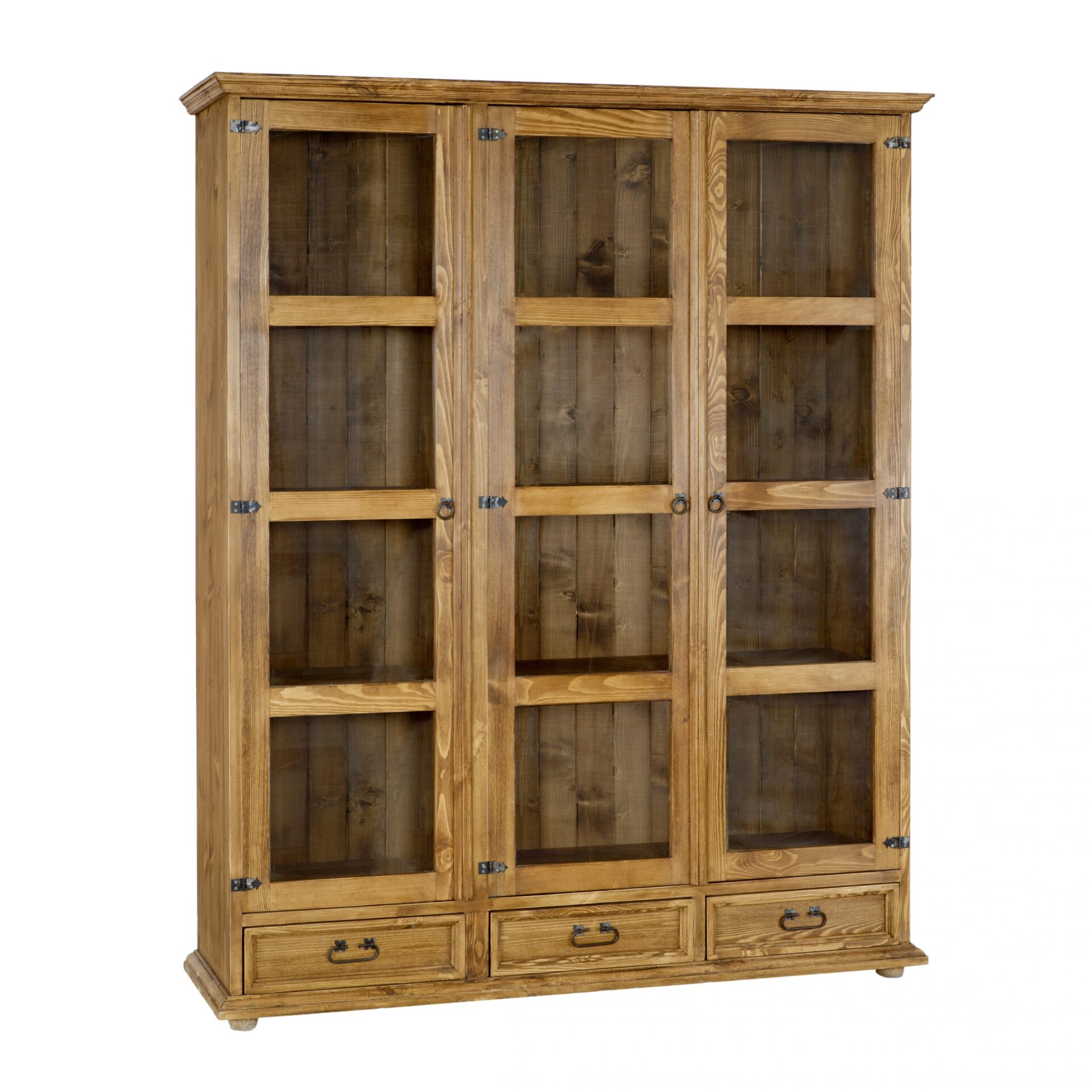 Trijų durų vaškuota vitrina SLIM versijos KW709/I, sukurta kaimiško stiliaus, pagaminta iš tvirtos pušies medienos. Už stiklinių durelių yra trys lentynos, puikiai tinkančios laikyti pietų servizus, papuošalus, suvenyrus ar knygas. Apatinėje spintelės dalyje yra trys stalčiai ant medinių bėgelių. Spintelė pasižymi patvaria ir tvirta konstrukcija. Jos konstrukcijoje panaudotos rankų darbo metalinės rankenos ir vyriai su sendinta apdaila. KW709/I vitrina bet kokiam interjerui suteiks unikalios atmosferos, kupinos šilumos ir namų jaukumo. Jos funkcionalumas labai palengvins daiktų laikymą.