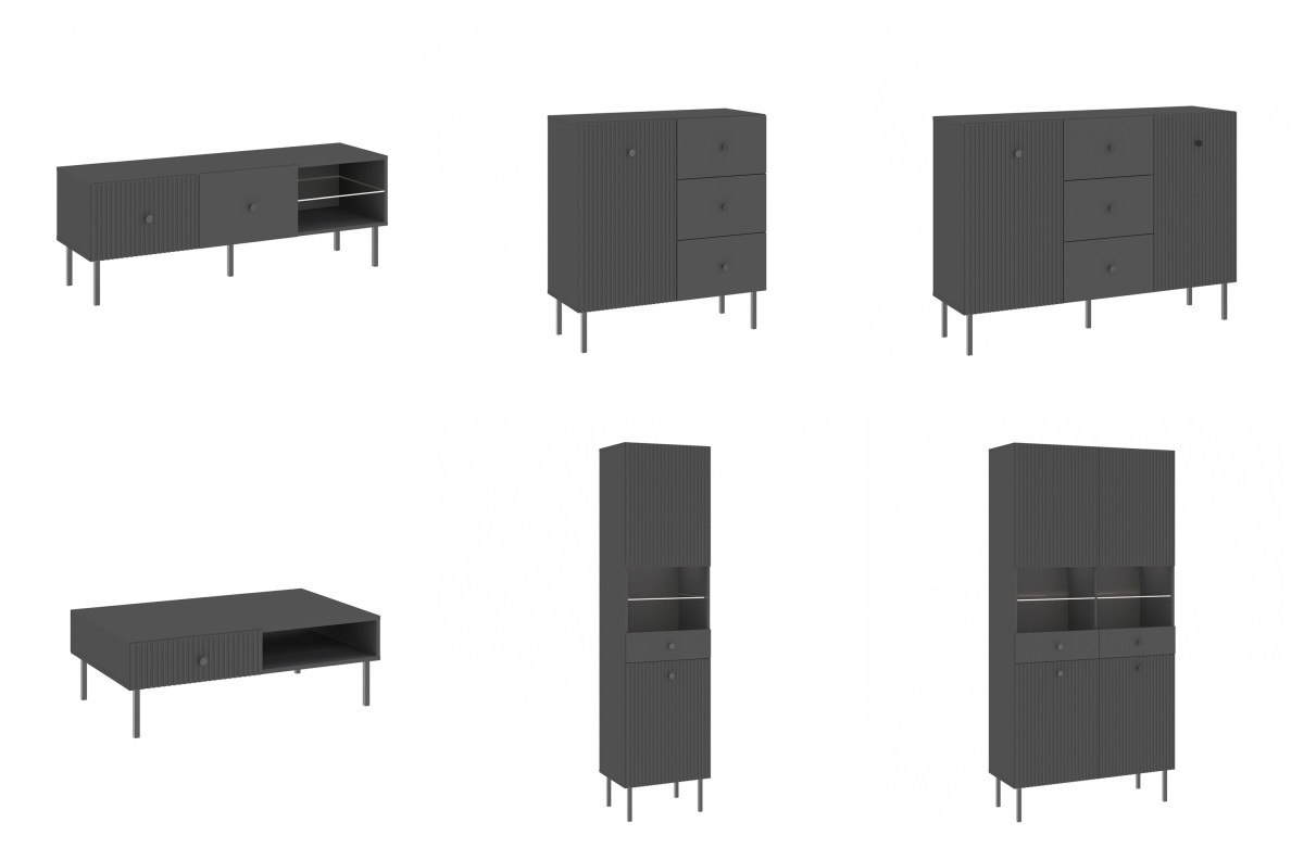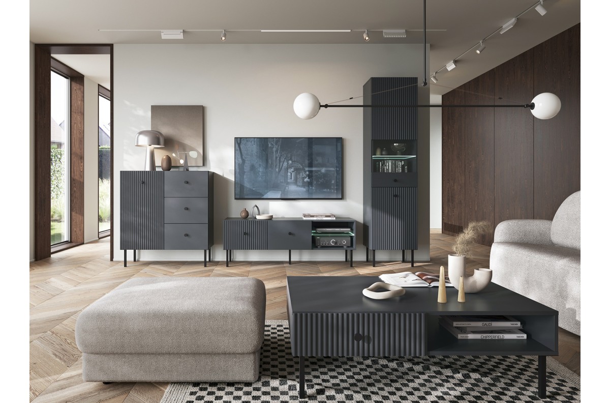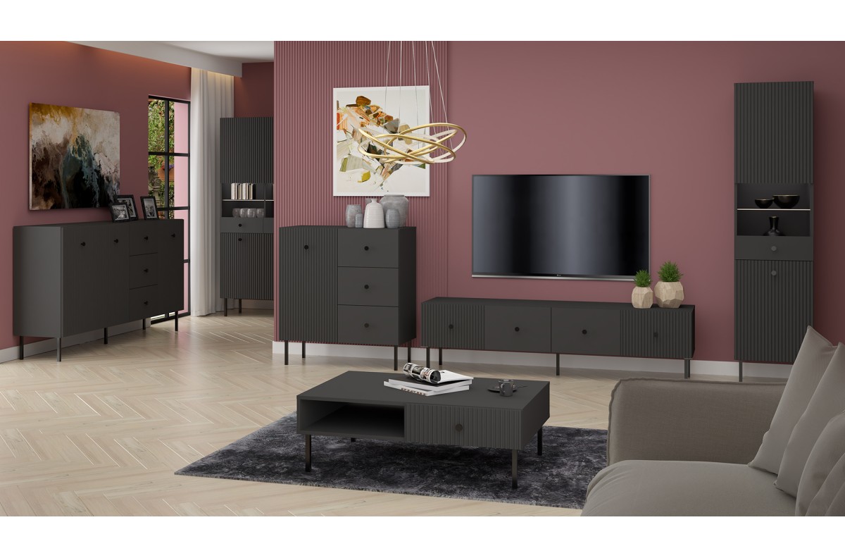 VIENNA 2D antracito/juodos spalvos vitrina – 1 durų spintelė su grioveliais fasaduose