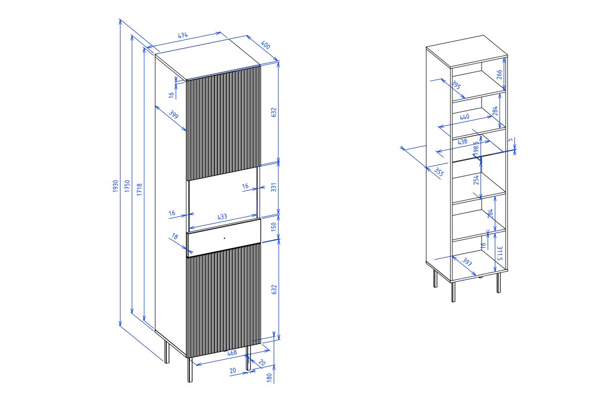 PLOTIS 45 cm, GYLIS 42 cm, AUKŠTIS 193 cm, MEDŽIAGOS Medžio drožlių plokštė/MDF, stiklas, milteliniu būdu dažytas plienas, PAVIRŠIUS Matinis, STILIUS Modernus / Žavingas, SVORIS SU PAKUOTE 45 kg, KITA Gaminys skirtas savarankiškam surinkimui su pateiktomis instrukcijomis