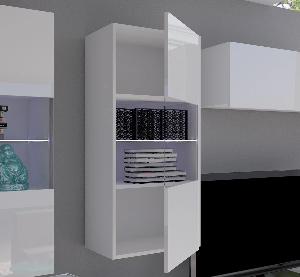 Vitrinos stiklinis priekis leis jums pademonstruoti aksesuarus, kurie puošia jūsų svetainę. Subtiliai išsikišęs priekis taip pat atlieka rankenos funkciją. Vitrina pagaminta iš aukštos kokybės laminuotos plokštės, kuri yra atspari išoriniams veiksniams, tokiems kaip įlenkimai, smūgiai ir įbrėžimai.