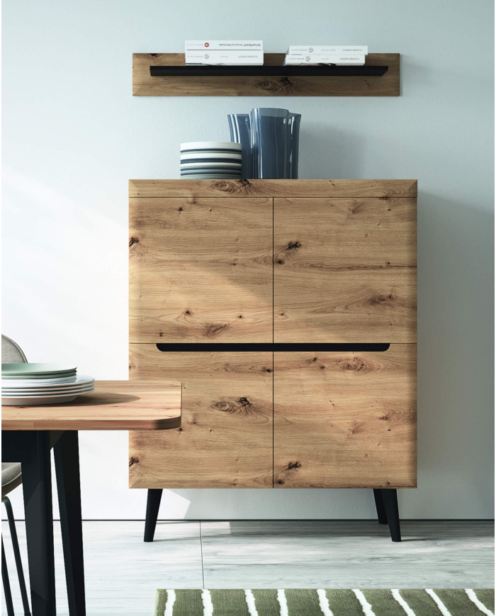 Aukšta „Nordi NWT53“ vitrina pagaminta iš įbrėžimams atsparios laminuotos plokštės su „Artisan Oak“ apdaila ir juodais akcentais ir yra to paties pavadinimo baldų programos dalis. Komplektas turi dalinai įstiklintą priekinę dalį, pagamintą iš grūdinto apsauginio stiklo ir patvarios MDF plokštės. Viduje yra keturios dailylentės ir viena stiklinė lentyna. Visas blokas stovi ant tvirtų, 20 cm aukščio juodų medinių kojelių. Vitrina pristatoma supakuota su lengvai suprantamomis surinkimo instrukcijomis. Vidinį apšvietimą galima įsigyti gaminių vedlyje.