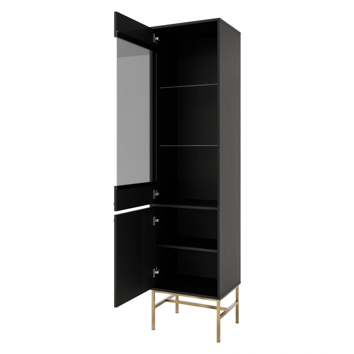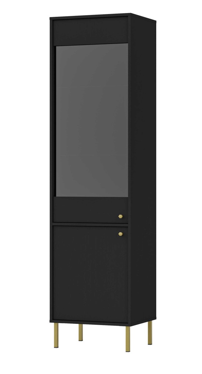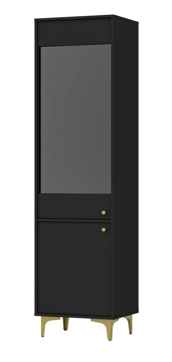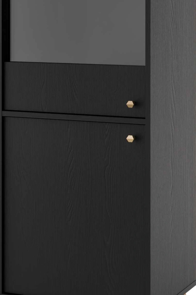 „Tokyo 2D“ vitrina su juodomis spintelėmis – grūdintas, poliruotas stiklas, grafito neslidi danga, 4 mm storio, lentynos pagamintos iš poliruoto, skaidraus stiklo, 5 mm storio – turi dvi spinteles.