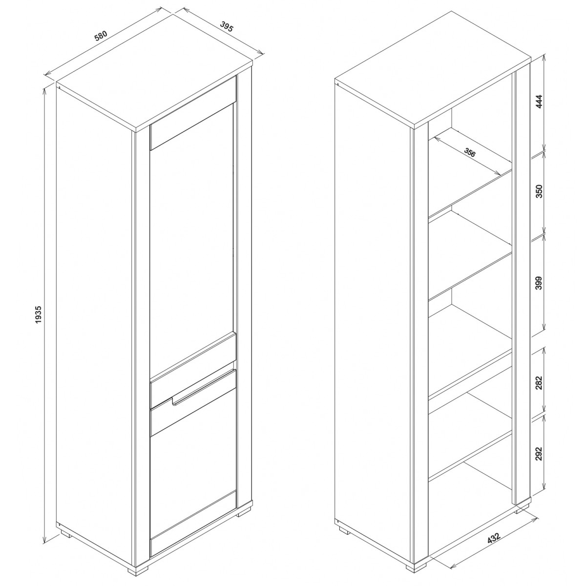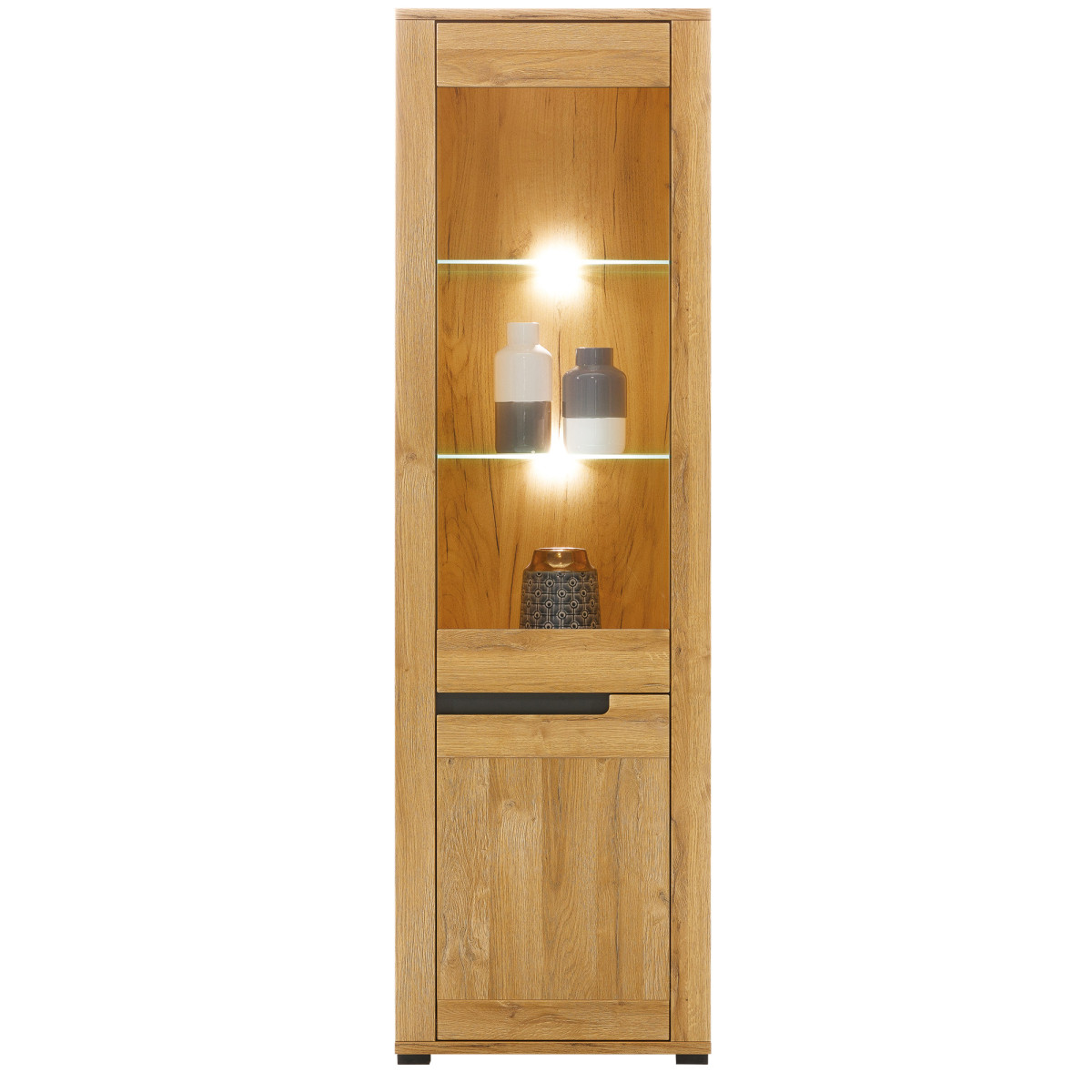 YORK Y05 L/R vitrina – tai unikali, vienų durų spintelė, kuri tiks bet kuriame kambaryje, subtiliai pabrėždama jo dizaino grožį. Jos viduje yra trys nišos už stiklinių durelių, skirtos įvairiems stikliniams indams ir dekoracijoms eksponuoti, ir dvi nišos už masyvių durelių, skirtos naudingiems daiktams laikyti. Už papildomą mokestį stiklinių lentynų dalyje galima įrengti LED apšvietimą. Papildomas privalumas – galimybė įrengti dureles taip, kad jos atsidarytų į kairę arba į dešinę. Šilto medžio atspalvio ir grafito elementų derinys spintelėje traukia akį ir sukuria tikrai dizainerio stiliaus baldą bet kokiam interjerui. Fasadai be rankenėlių suteikia lengvumo ir pabrėžia unikalų baldų charakterį. Spintelė idealiai tinka derinti su kitais YORK serijos baldais arba naudoti kaip atskiras baldas, leidžiantis ją pritaikyti prie savo kambario dizaino.