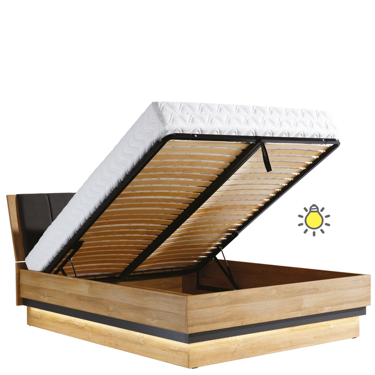 Lova YORK Y18 – būtinas bet kurio miegamojo baldas. Ji pasižymi moderniu ir stilingu dizainu. Lovą sudaro rėmas ir apmuštas galvūgalis, pagamintas iš TATUM šenilinio audinio, užtikrinančio nugaros komfortą skaitant ar žiūrint televizorių. Čiužinys ir rėmas į komplektą neįeina; juos galima įsigyti atskirai. Šilto medžio atspalvio, grafito spalvos lovos elementų ir apmušto galvūgalio derinys patraukia akį ir sukuria tikrai dizainerio stiliaus baldą bet kokiam interjerui. Be to, lovos rėmą galite apšviesti LED juostele (už papildomą mokestį), taip sukurdami subtilų švytėjimą ir romantišką atmosferą. Lova yra trijų dydžių: 140 cm, 160 cm ir 180 cm. Ji puikiai papildys kitus YORK kolekcijos baldus arba bus naudojama kaip atskiras baldas.