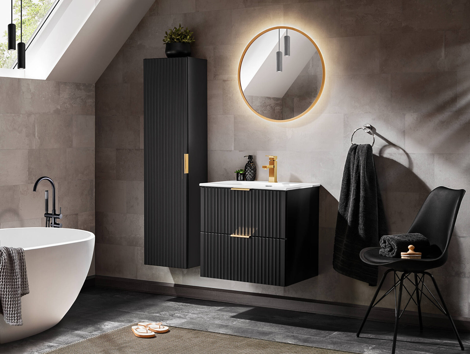 Į krepšelį Palyginti Vonios kambario baldų komplektai COMAD Praustuvo spintelės baldų komplektas 60 cm, 2 stalčiai, Talia Casella, juodas matinis 197.86€