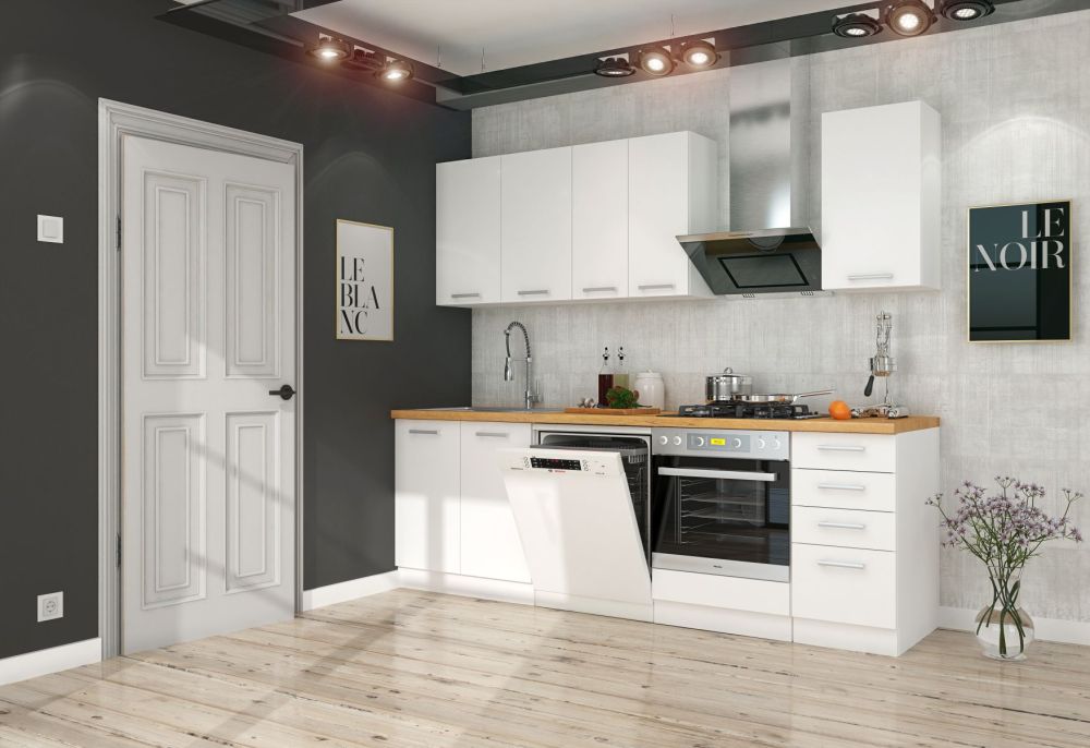 „Eko White 250/340 cm“ kampinė virtuvė – tai virtuvės baldų komplektas, kurio paprastos, lengvos formos ir ryškios, madingos spalvos papildys bet kokį modernų interjerą, o horizontalus, šviesus raštas vizualiai padidins bet kurią mažą virtuvę. Komplektą sudaro: