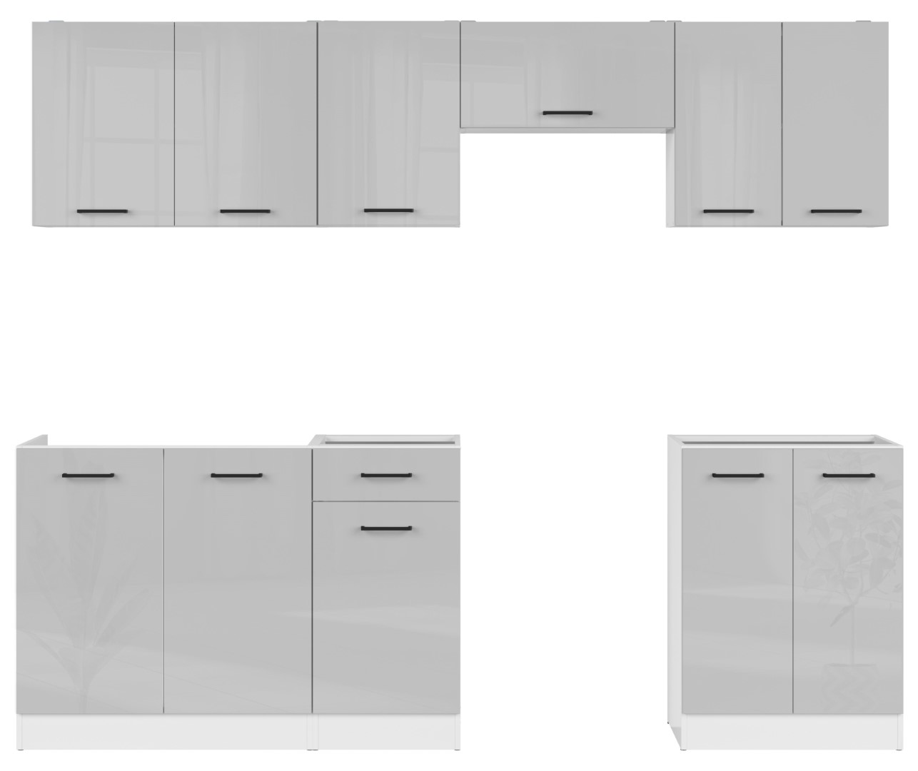 „Junona Line 240“ virtuvė – kompaktiškas virtuvės dizainas. Su „Junona Line 240“ virtuvės komplektu galite sukurti įvairias virtuvės konfigūracijas su atskiromis skalbimo, maisto ruošimo, laikymo ir maisto gaminimo zonomis. Visa tai dėka erdvių, gilių viršutinių spintelių, kuriose telpa indai, stiklinės, lėkštės, maisto laikymo indai, taip pat kavos ir arbatos indai. Apatinėse spintelėse yra vietos puodams, puodams, virtuvės įrankiams ir šiukšliadėžei. 240 cm pločio virtuvės komplekte galima įmontuoti gartraukį, laisvai pastatomą viryklę ir dvigubą kriauklę. Jį galite pastatyti kaip atskirą įrenginį mažoje virtuvėlėje arba išplėsti jį papildomais tos pačios kolekcijos moduliais. Be funkcionalumo, „Junona Line“ komplekto estetinis patrauklumas ir nesenstanti spalvų gama traukia akį. Baltos spintelės sukuria neutralų foną šviesiai pilkiems blizgiems viršutiniams fasadams. Minimalistinės rankenėlės užbaigia bendrą vaizdą. Nesenstanti spalvų gama puikiai papildo bet kokį interjerą, vizualiai jį padidindama. Norėdami papildyti „Junona Line“ komplektą, rinkitės kitus tos pačios kolekcijos elementus. Galite pasirinkti papildomus modulius arba atskiras spinteles, kad sukurtumėte modernų virtuvės išdėstymą.