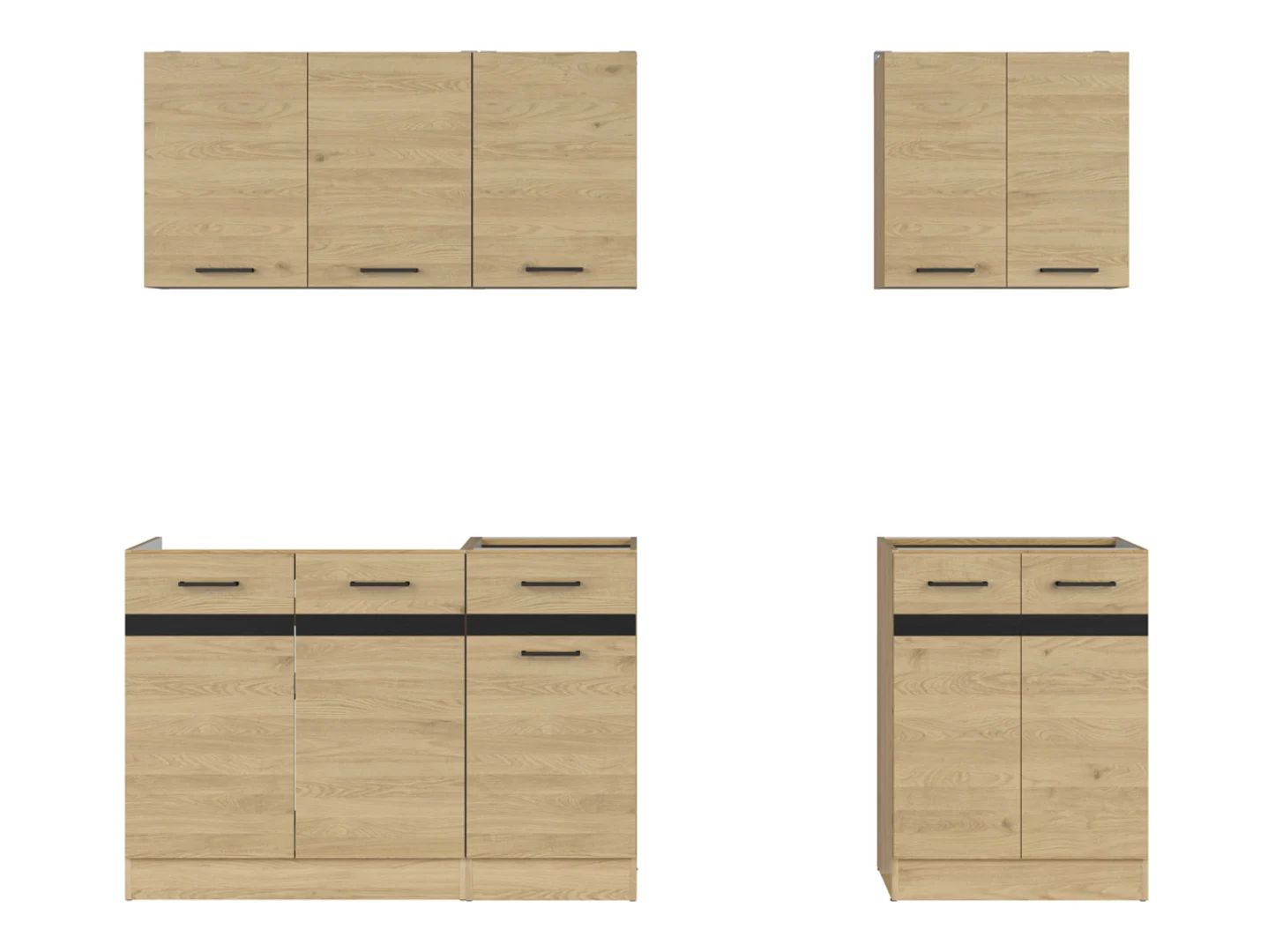 „Junona Line“ kolekcija garantuos komfortą ir funkcionalumą jūsų virtuvėje. Su „Junona Line“ komplektais galite ergonomiškai sutvarkyti net ir nedidelę erdvę, o dėl galimybės išplėsti komplektą papildomomis spintelėmis galite susikurti erdvę, pritaikytą jūsų poreikiams. Su „Junona Line 180A“ virtuvės komplektu galite sutvarkyti savo virtuvę, atskirdami atskiras zonas: daiktų laikymo, ruošimo, maisto gaminimo ir plovimo. Erdviose viršutinėse spintelėse telpa indai, stiklinės, lėkštės, taip pat kavos ir arbatos pakuotės bei daugelis kitų produktų. Apatinėse spintelėse telpa puodai, puodai, virtuvės reikmenys ir šiukšliadėžė. 180 cm pločio virtuvės komplektas leidžia sutalpinti 50 arba 60 cm pločio laisvai pastatomą viryklę. Komplektą galite naudoti kaip savarankišką įrenginį mažoje virtuvėlėje arba išplėsti jį papildomais tos pačios kolekcijos moduliais. Komplekte nėra nuotraukose pavaizduotų prietaisų. „Junona Line“ komplektas pasižymi ne tik funkcionalumu, bet ir nesenstančia spalvų gama. Bernstein ąžuolo karkasai ir tos pačios spalvos fasadai su dekoratyviniu juodu įdėklu sukuria harmoniją ir suteikia interjerui unikalų charakterį. Paprastos juodos rankenėlės užbaigia vaizdą. Papildykite „Junona Line“ komplektą kitais tos pačios kolekcijos elementais. Pasirinkite papildomus komplektus arba atskiras spinteles ir susikurkite modernią virtuvę, pritaikytą jūsų poreikiams. Viską, ko reikia jūsų virtuvei, rasite emkameble.pl.