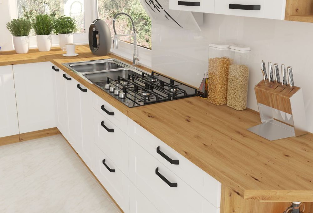 2,8 cm arba 3,8 cm storio stalviršiai, pagaminti naudojant pokalimo technologiją, su ergonomiškai užapvalinta priekine dalimi (nebūtina)
