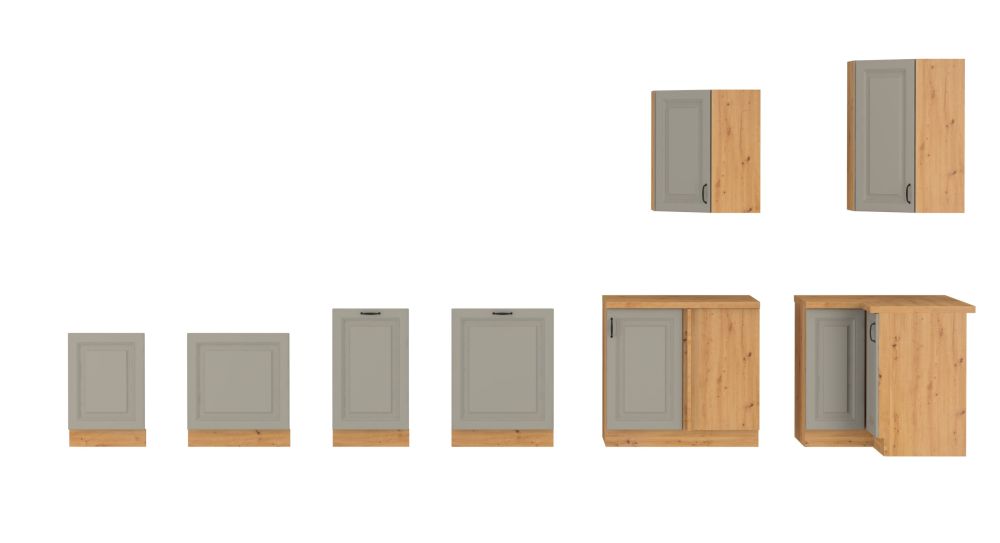 Priekinės dalys: 16 mm molio pilkumo MDF su frezavimu – 1 mm ABS apvadas (pilkas su smėlio atspalviu)