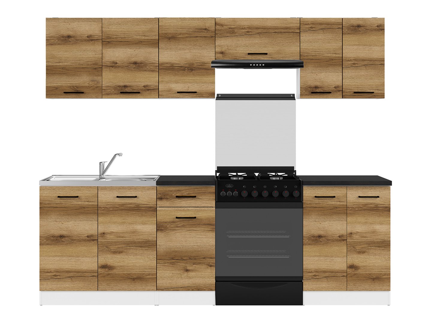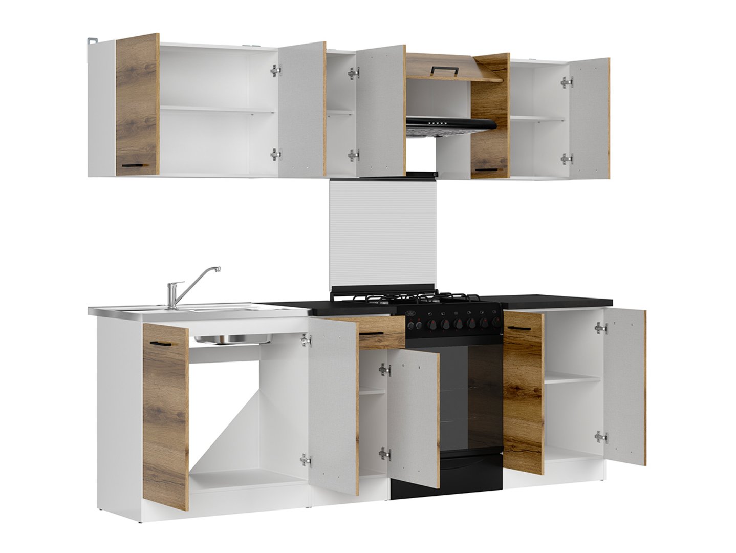 „Junona Line“ kolekcija garantuoja komfortą ir funkcionalumą jūsų virtuvėje. Su „Junona Line“ komplektais galite ergonomiškai sutvarkyti net ir mažą erdvę, o išplėsdami komplektą papildomomis spintelėmis, galite susikurti erdvę, pritaikytą jūsų poreikiams. Su „Junona Line 240“ virtuvės komplektu galite sutvarkyti savo virtuvę, atskirdami atskiras zonas: daiktų laikymo, ruošimo, maisto gaminimo ir plovimo. Erdviose viršutinėse spintelėse telpa indai, stiklinės, lėkštės, taip pat kavos ir arbatos pakuotės bei daugelis kitų produktų. Apatinėse spintelėse telpa puodai, puodai, virtuvės reikmenys ir šiukšliadėžė. 240 cm pločio virtuvės komplektas leidžia įmontuoti 60 cm pločio laisvai pastatomą viryklę arba, įsigijus orkaitės spintelę su stalviršiu, įrengti virtuvę orkaite ir įmontuojama kaitlente. Komplektą galima naudoti kaip atskirą įrenginį mažoje virtuvėlėje arba išplėsti papildomais tos pačios kolekcijos moduliais. „Junona Line“ komplektas pasižymi ne tik savo funkcionalumu, bet ir nesenstančia spalvų gama. Baltos spintelės ir šviesaus ąžuolo „Delano“ fasadai sukuria harmoningą harmoniją ir suteikia interjerui unikalų charakterį. Šiuolaikiškos juodos rankenėlės ir kontrastingas juodo aukso spalvos metalinis skalūno stalviršis užbaigia vaizdą. Derinkite „Junona Line“ komplektą su kitais tos pačios kolekcijos elementais. Pasirinkite papildomus komplektus arba atskiras spinteles ir susikurkite modernią virtuvę, pritaikytą jūsų poreikiams. Viską, ko reikia jūsų virtuvei, rasite adresu emkameble.pl.