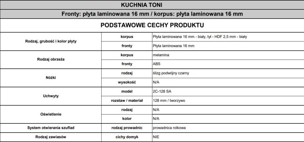 „Toni“ segmentas yra idealus sprendimas biudžetinėms virtuvėms, studijos tipo apartamentams, virtuvėlėms, viešbučių bufetams arba kaip virtuvės kampelis nuosavybėje. „Toni“ sistemos parametrai: