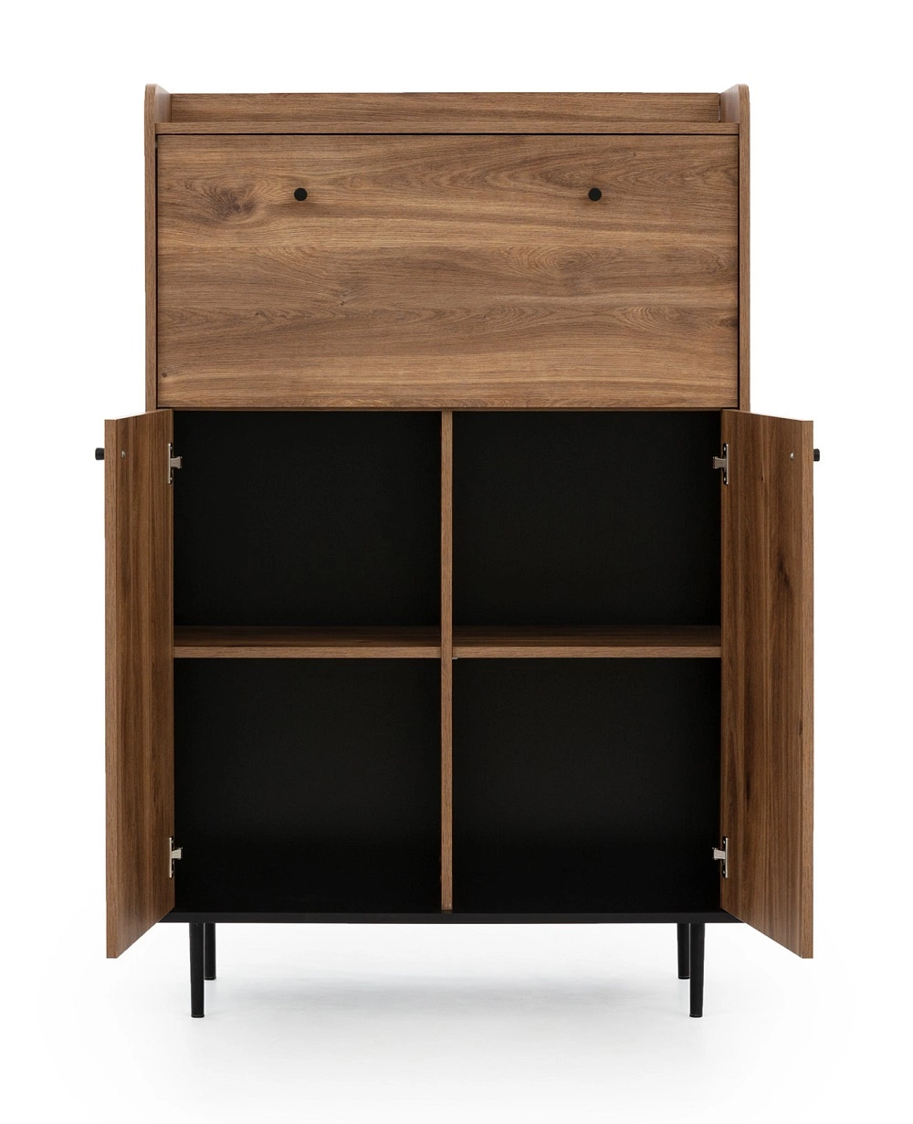 Sieninė spintelė pagaminta iš aukštos kokybės 16 mm laminuotos plokštės, kuri yra atspari išoriniams veiksniams, tokiems kaip įlenkimai, smūgiai ir įbrėžimai. Mažos juodos rankenėlės stilingai užbaigia sieninės spintelės priekinę dalį. Kiekvieną spintelę laiko metalinis pagrindas. Erdvioje komodoje tilps visi priedai ir buitinė technika. Atviros televizoriaus staliuko lentynos puikiai tinka televizoriaus įrangai. Kavos staliuko viršus yra atsparus išsiliejimui.