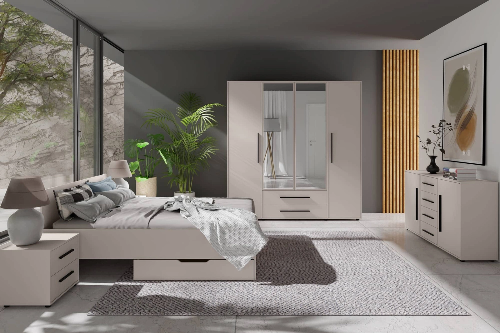 „Maxione“ smėlio spalvos miegamojo baldų komplektas yra paprastas, tačiau labai stilingas ir modernus baldas.