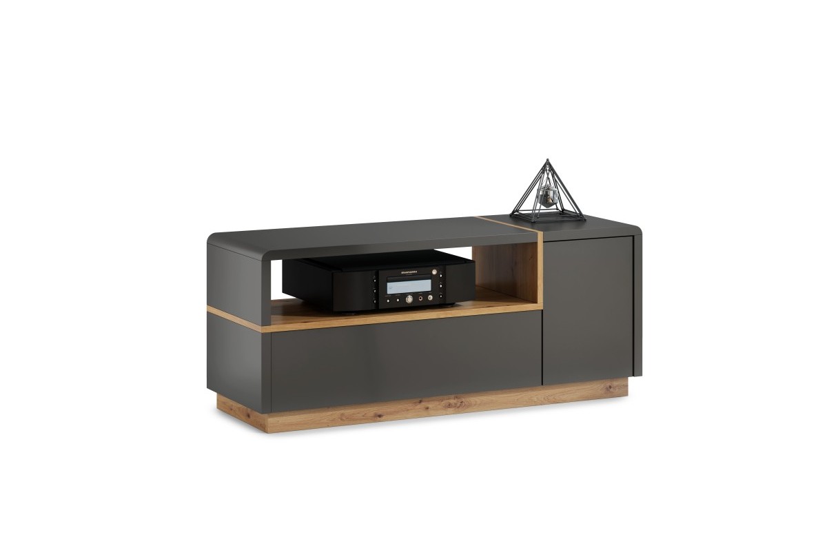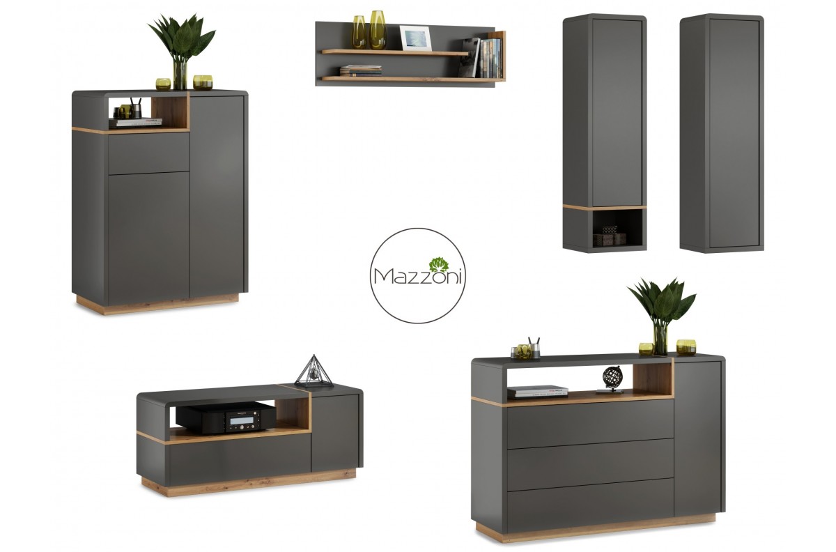 FOLK antracito (tamsiai pilkos) / amatininko ąžuolo baldų komplektas – MODERNI SVETAINĖS SIENINĖ SPINTELĖ SU MAŽA TV SPINTELĖLE