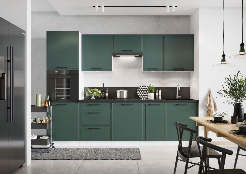 Virtuvės stilius – modernus | Fasado tipas: Laminuota plokštė / MDF / Lakuota MDF plokštė, 16 mm storio, padengta PVC folija | Matmenys: gylis [cm]>30; viršutinis gylis be stalviršio [cm]>52,4; gylis su stalviršiu [cm]>60; plotis [cm]>180–240; aukštis [cm]>72; viršutinis aukštis be stalviršio [cm]>82