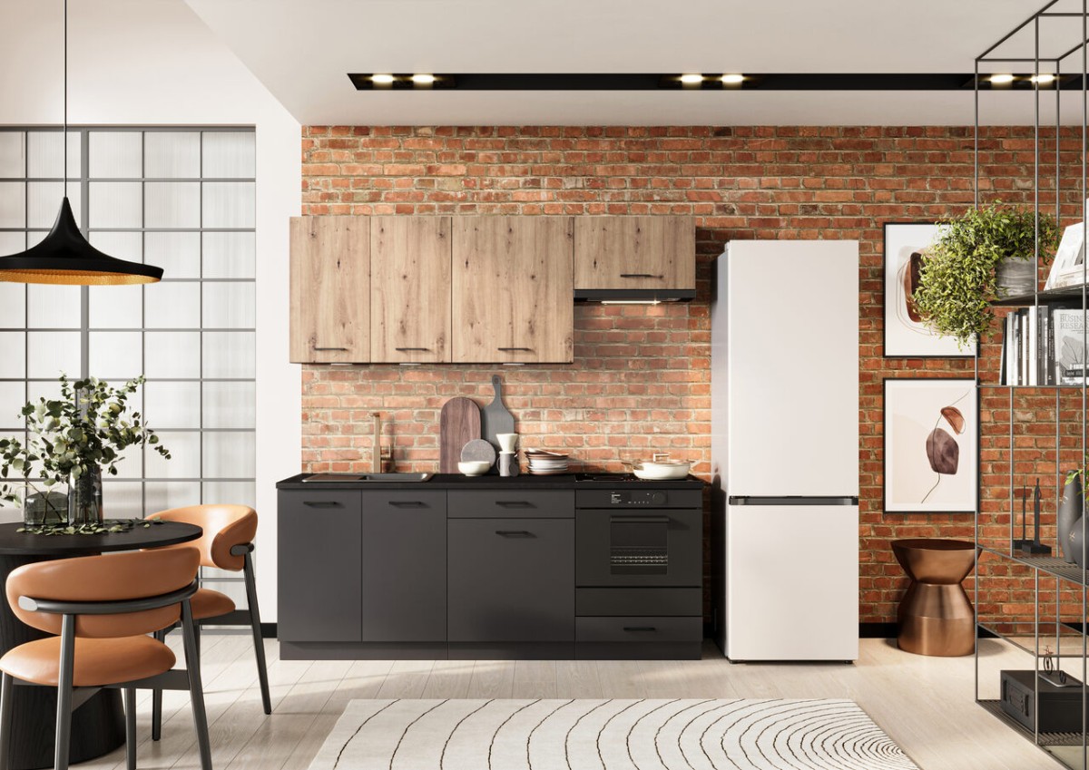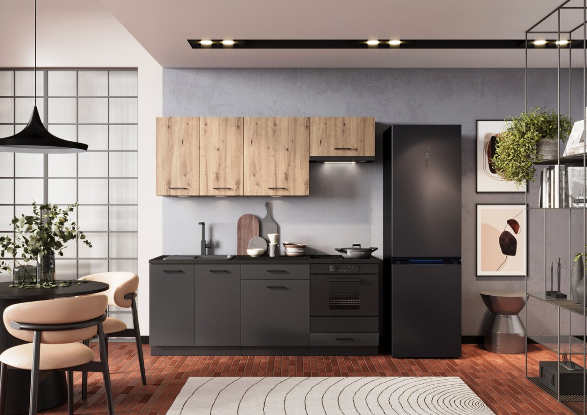 Virtuvės specifikacija – dirbtinio ąžuolo arba grafito | Virtuvės stilius – modernus | Fasado tipas: laminuota plokštė / MDF / lakuota laminuota plokštė; vyrių / stalčių tipas